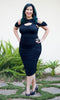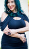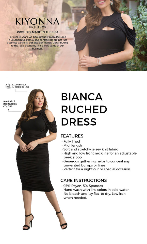 Hug every curve in our plus size bodycon Bianca Ruched Dress. With a subtly sexy peek-a-boo neckline and draped cold shoulder sleeves, the features of this dress are a sure knockout for any occasion. This cold shoulder dress is available exclusively in women's plus sizes.