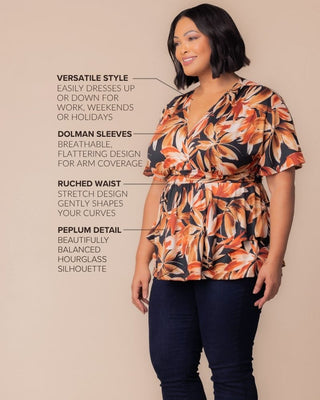 Requested over and over by our customers, the Encore Print Top lives up to its name and is a must have wardrobe essential. Comfort and style combine when design details like kimono sleeves and a flattering crossover bodice provide ample coverage and an effortless, easy fit. The layering front illusion and soft fabric make this plus size top a customer favorite season after season.