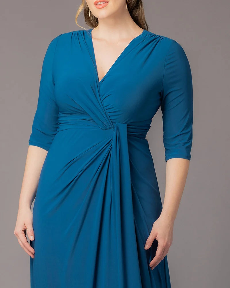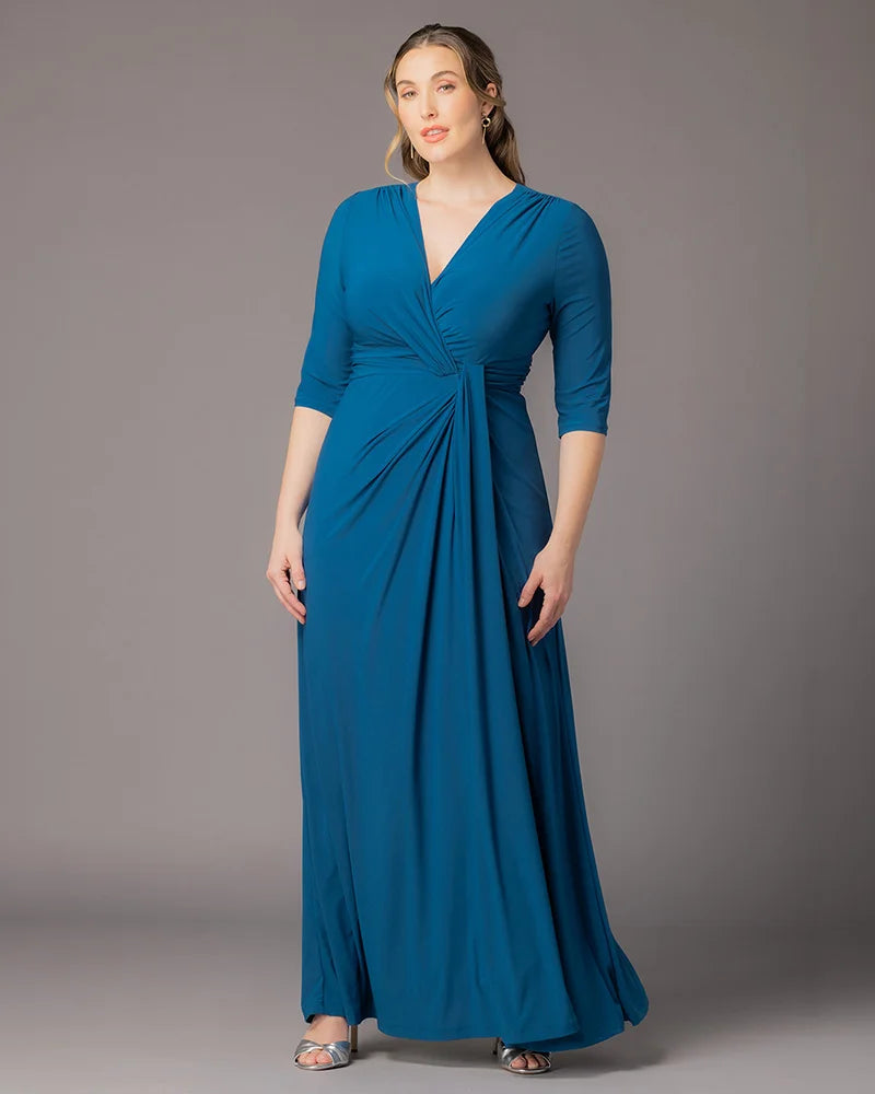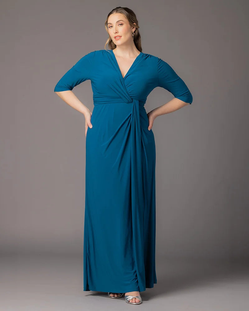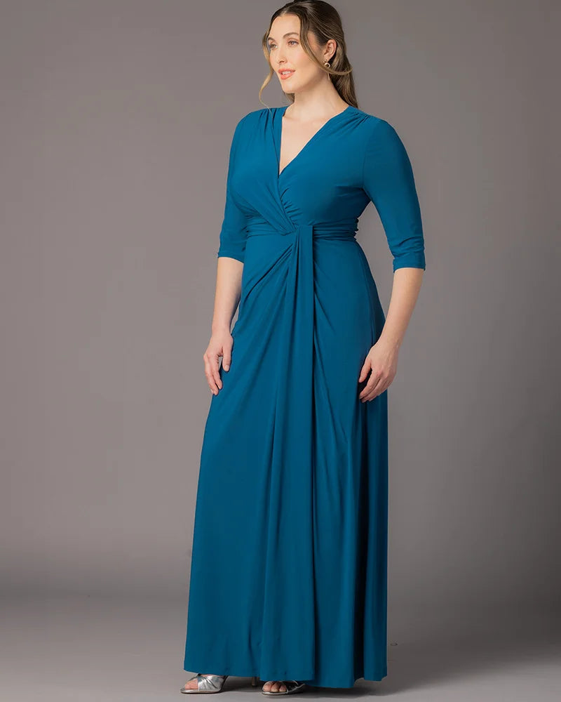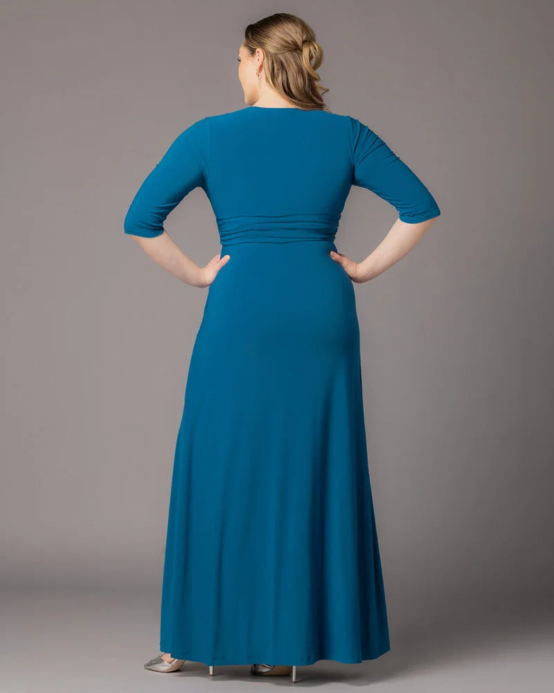 Step into timeless elegance with the Evening Romance Gown, a stunning plus size floor-length dress designed to flatter your curves. Featuring a surplice bodice, 3/4 length sleeves, and a cinched waist, this maxi dress drapes beautifully to create a graceful silhouette. Designed for black-tie events, formal galas, and any special occasion, it brings refined elegance to every setting. Whether you're celebrating as a wedding guest or the mother of the bride or groom, this gown offers effortless sophistication and timeless style for every unforgettable moment.