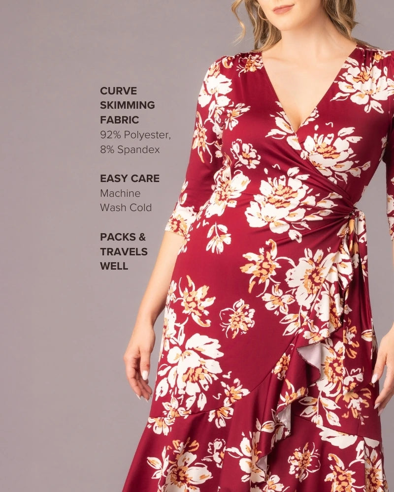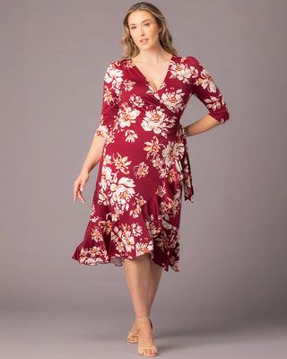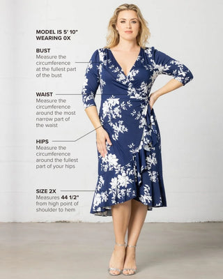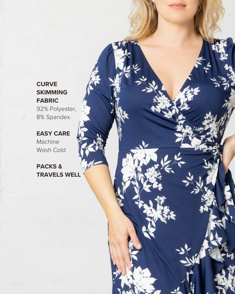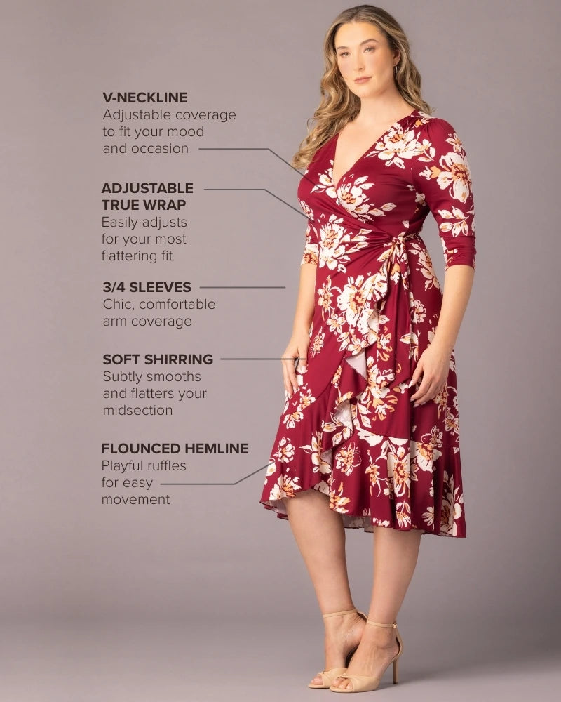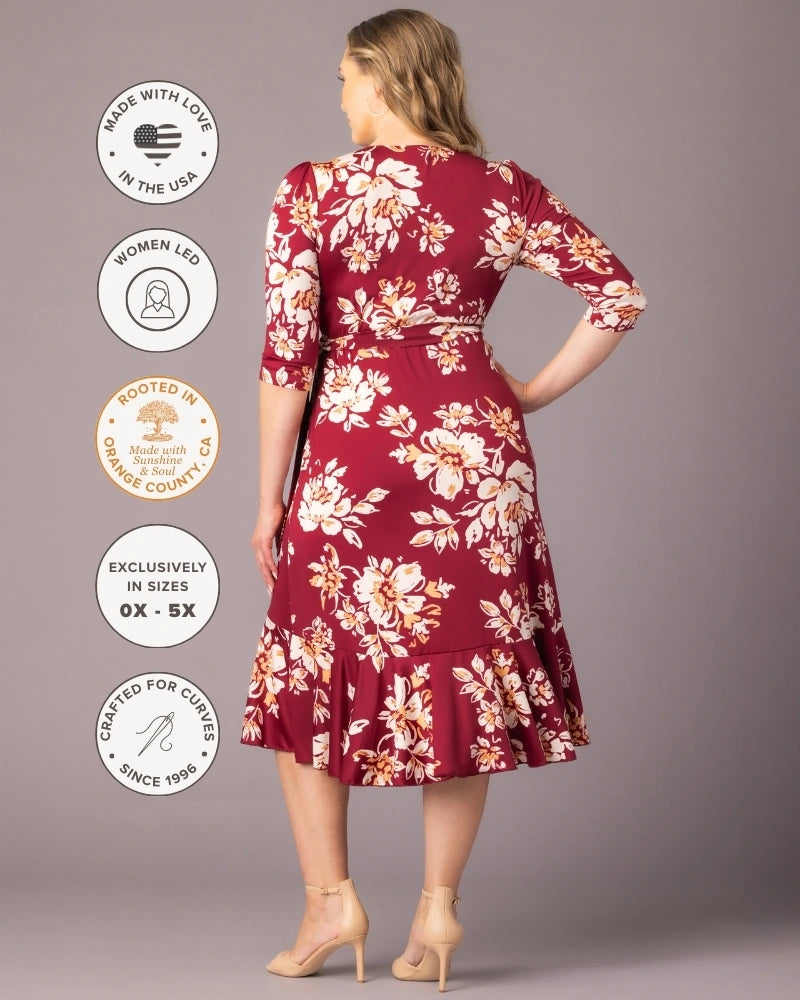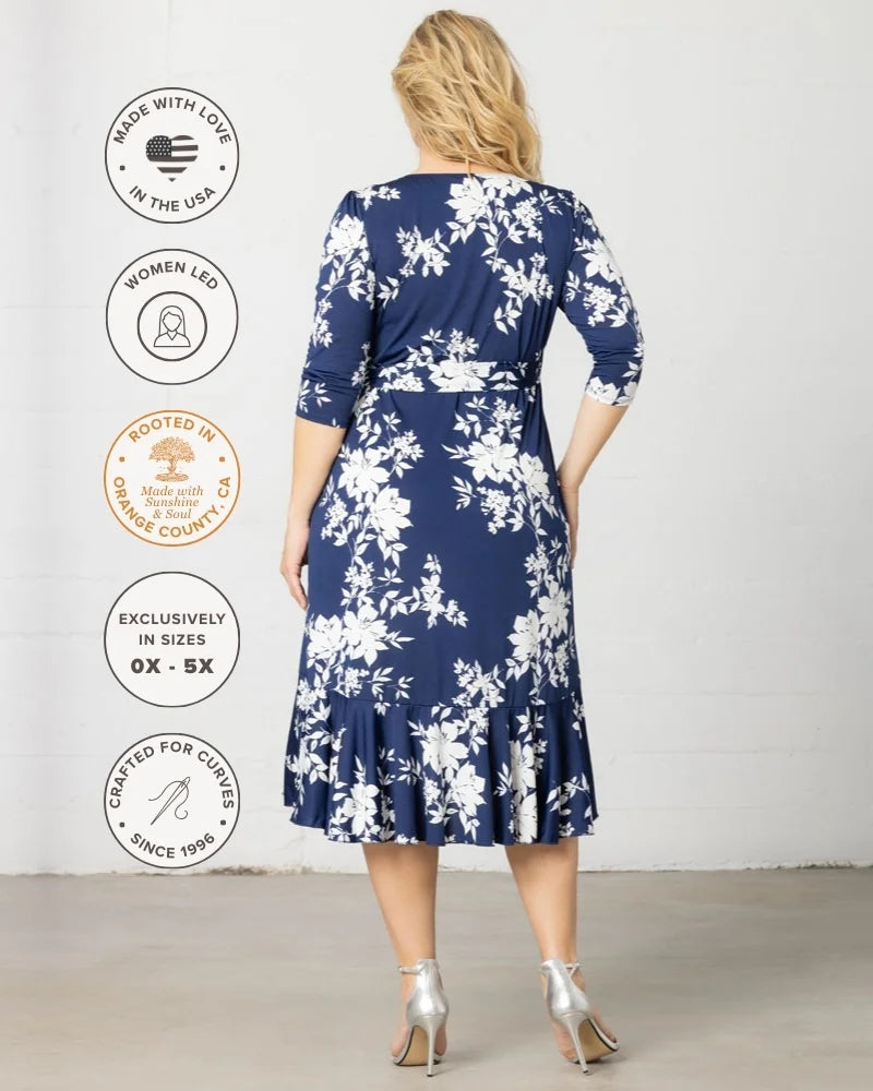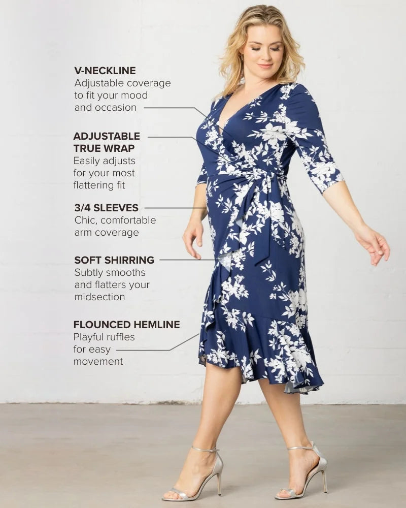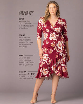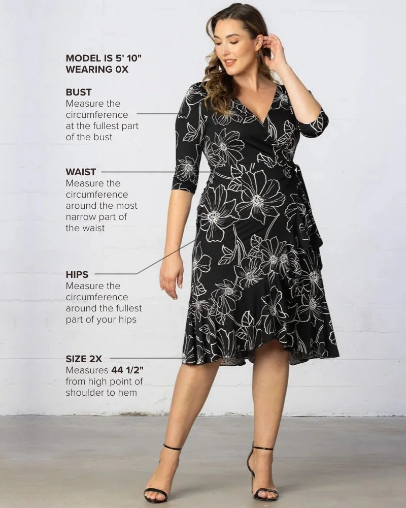 Exude playfulness with fun prints. Our Flirty Flounce Wrap Dress is designed with gorgeous cascading ruffles along the skirt's front panels and bottom hem. This fully functional plus size wrap dress is fantastic for adjusting to your preferred coverage and the cinch feature at the waist helps accentuate your fabulous curves. Wear to work or for a night out! This Kiyonna wrap dress is available exclusively in women’s plus sizes.