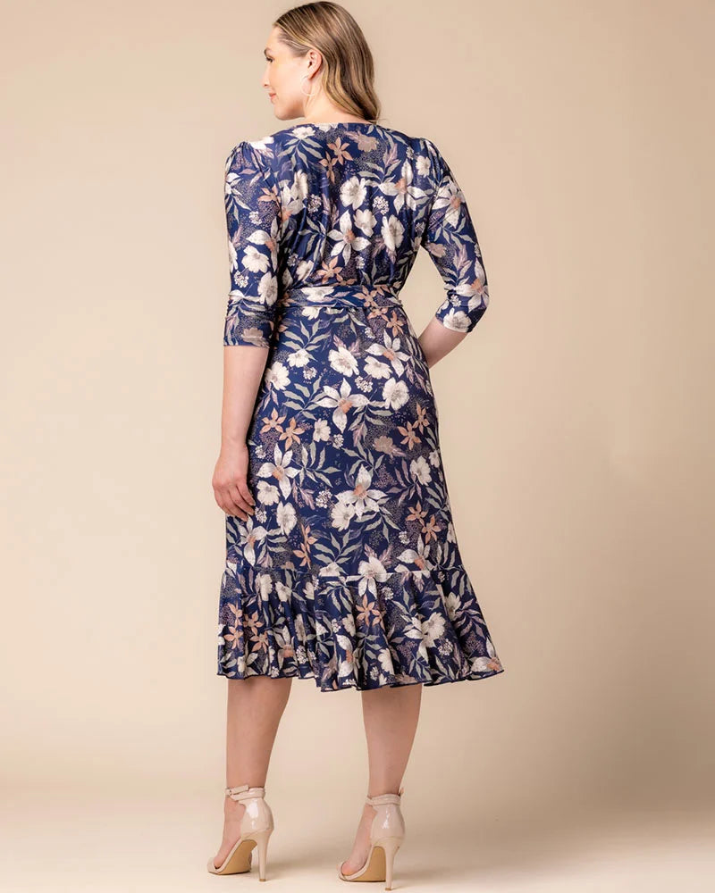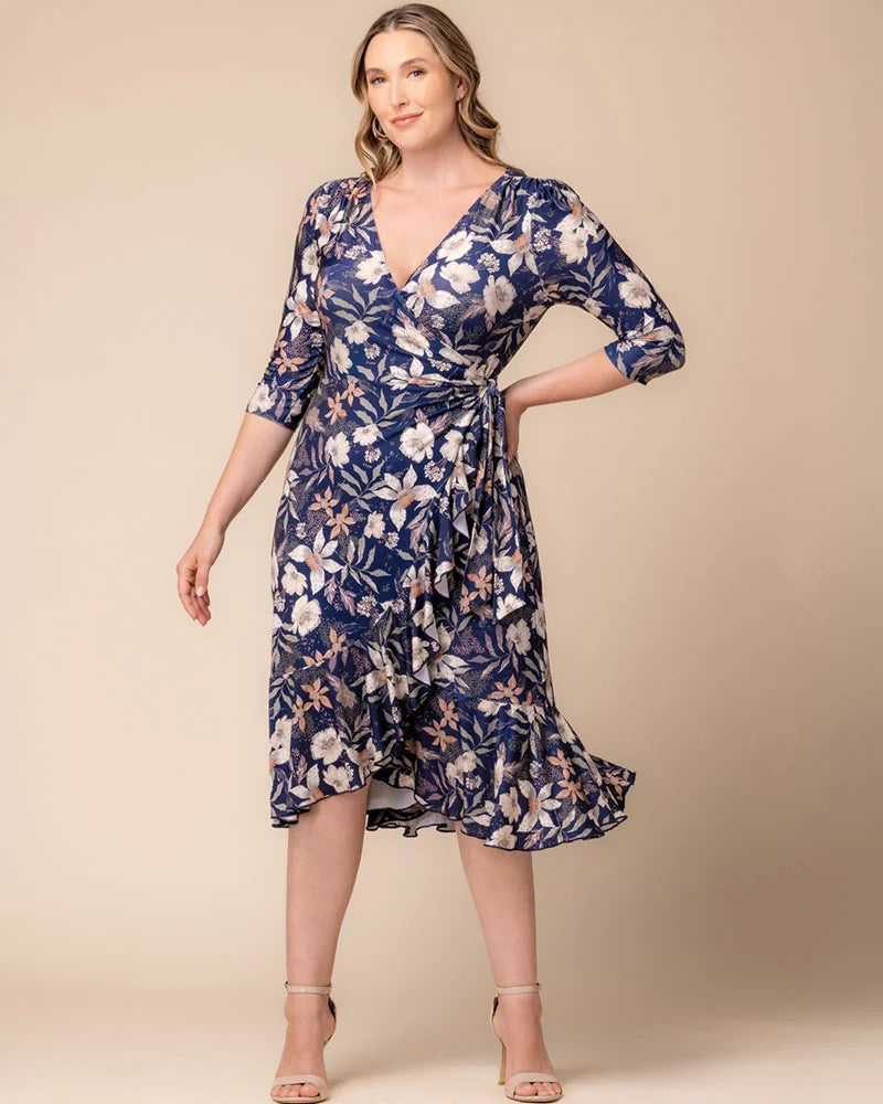 Exude playfulness with fun prints. Our Flirty Flounce Wrap Dress is designed with gorgeous cascading ruffles along the skirt's front panels and bottom hem. This fully functional plus size wrap dress is fantastic for adjusting to your preferred coverage and the cinch feature at the waist helps accentuate your fabulous curves. Wear to work or for a night out! This Kiyonna wrap dress is available exclusively in women’s plus sizes.