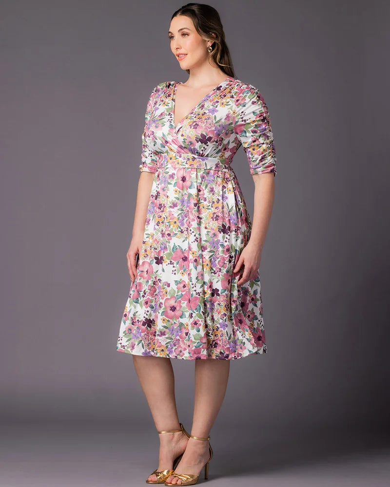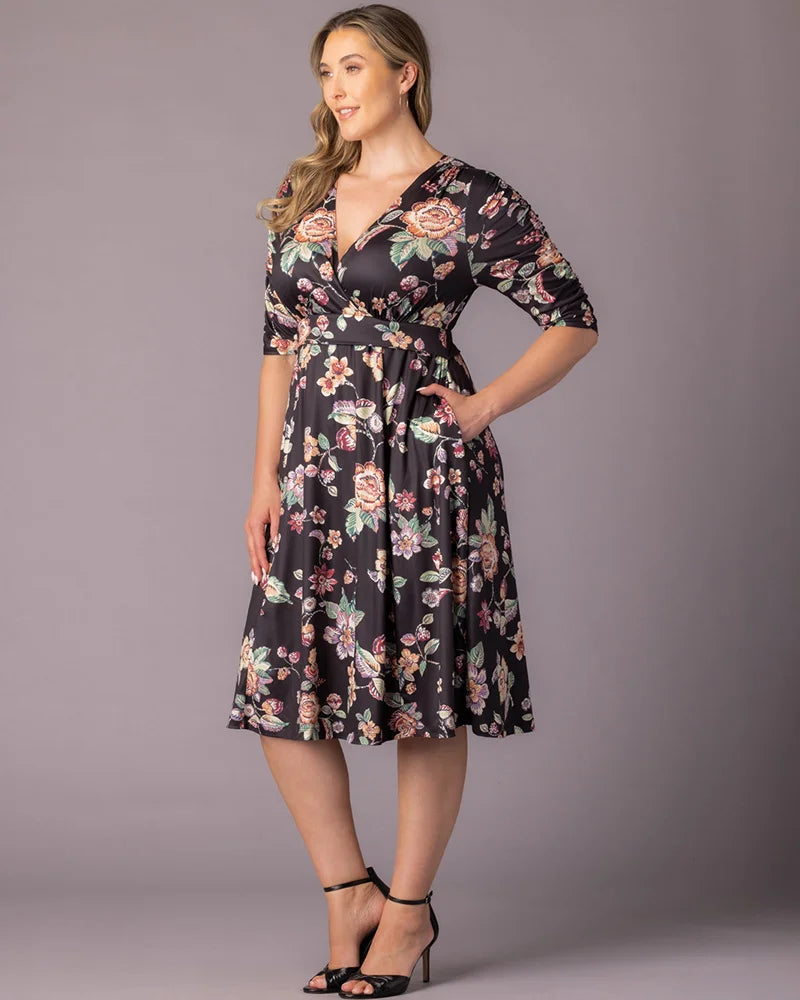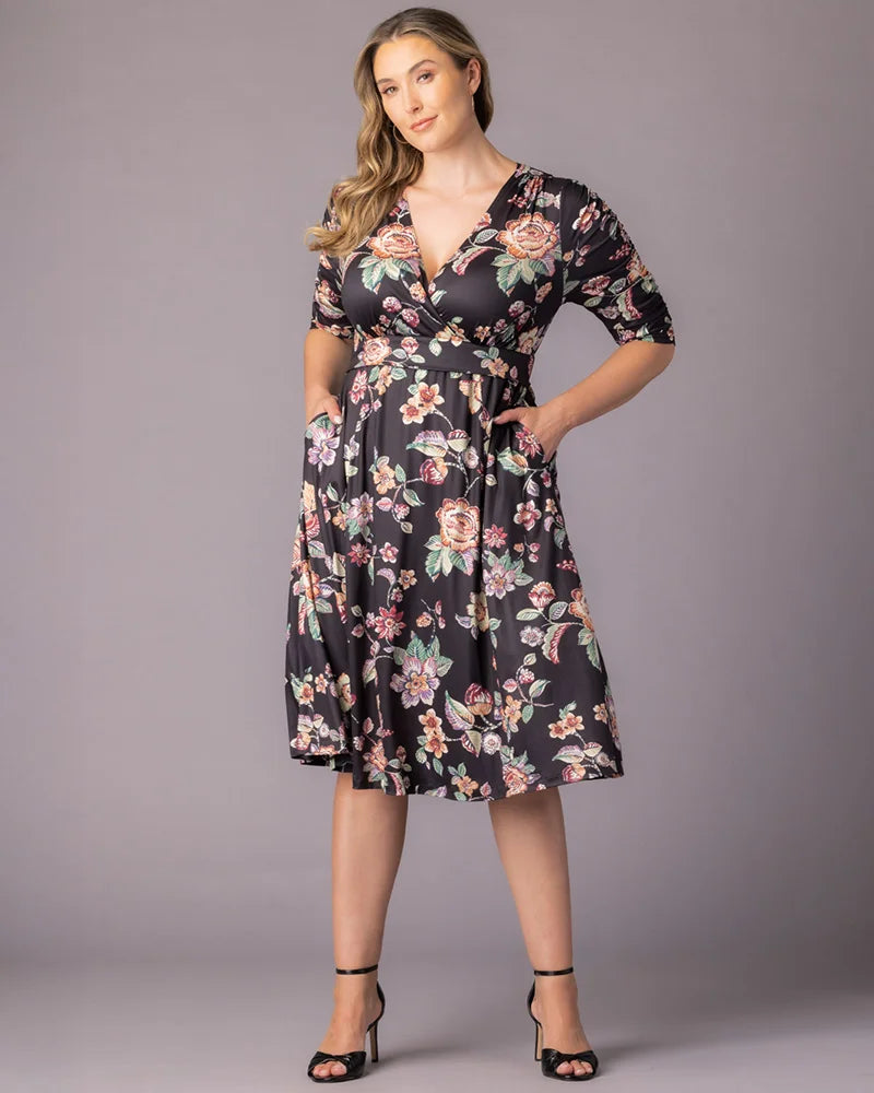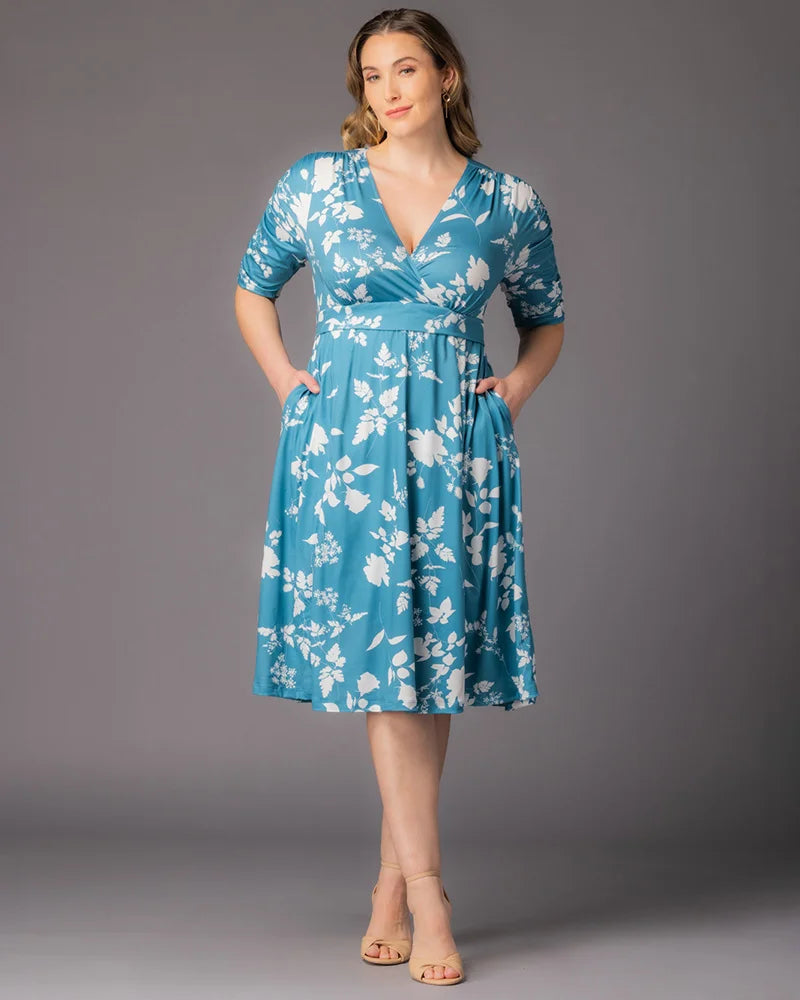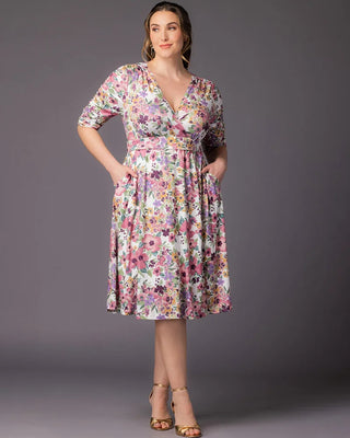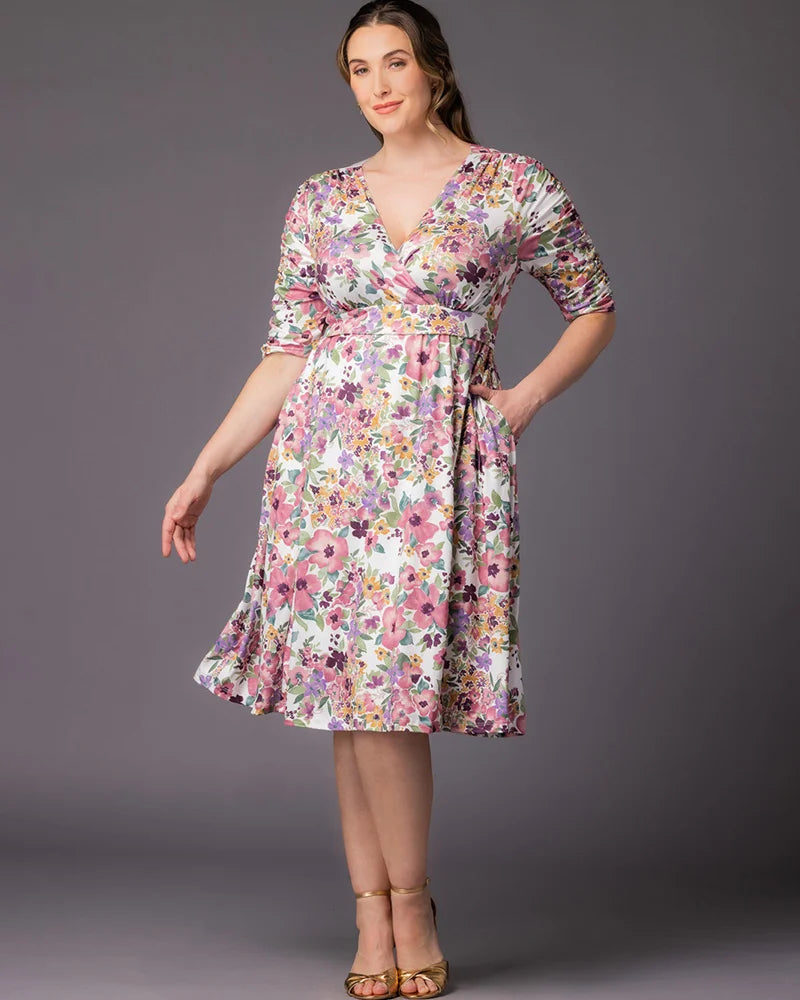 You'll feel beautiful in our retro-inspired Gabriella Dress. This flattering plus size A-line dress is designed with a surplice bodice and fully-lined skirt that will keep you both comfortable and stylish. Soft and thick jersey fabric fits beautifully without clinging. A playful print will put a pep in your step wherever you go. One last great detail about this dress? It's a jersey dress with pockets! Made exclusively in women's plus sizes.