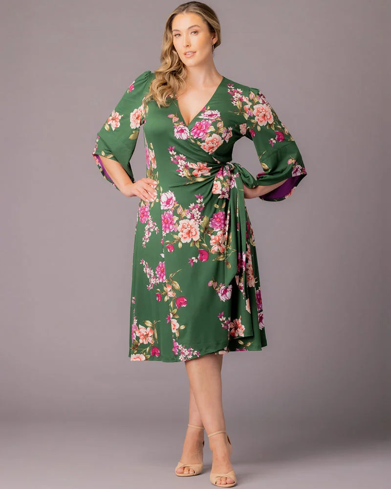 There are no two ways about it - the Gemini Wrap Dress will seamlessly take you from day to evening. Fashioned from a soft brushed jersey, this flattering plus size cocktail dress features a fashion forward seasonal print, wrap silhouette and dramatic mid-length bell sleeves with unique contrast lining. This midi-length party dress is perfect for a variety of special occasions, including weddings, birthdays, holidays and other celebrations. Available exclusively in curvy women's sizes (0x,1x,2x,3x,4x,5x, 12,14,16,18,20,22,24,26,28,30 and 32). Finally, plus size clothing made in the USA.
