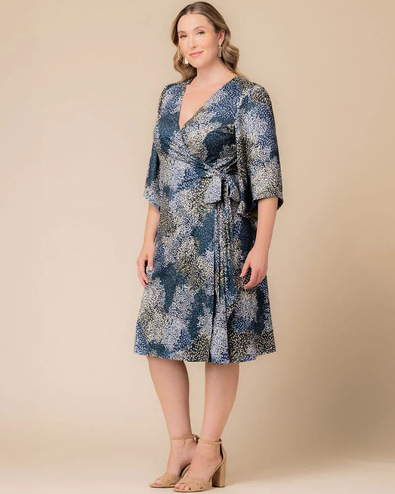 There are no two ways about it - the Gemini Wrap Dress will seamlessly take you from day to evening. Fashioned from a soft brushed jersey, this flattering plus size cocktail dress features a fashion forward seasonal print, wrap silhouette and dramatic mid-length bell sleeves with unique contrast lining. This midi-length party dress is perfect for a variety of special occasions, including weddings, birthdays, holidays and other celebrations. Available exclusively in curvy women's sizes (0x,1x,2x,3x,4x,5x, 12,14,16,18,20,22,24,26,28,30 and 32). Finally, plus size clothing made in the USA.