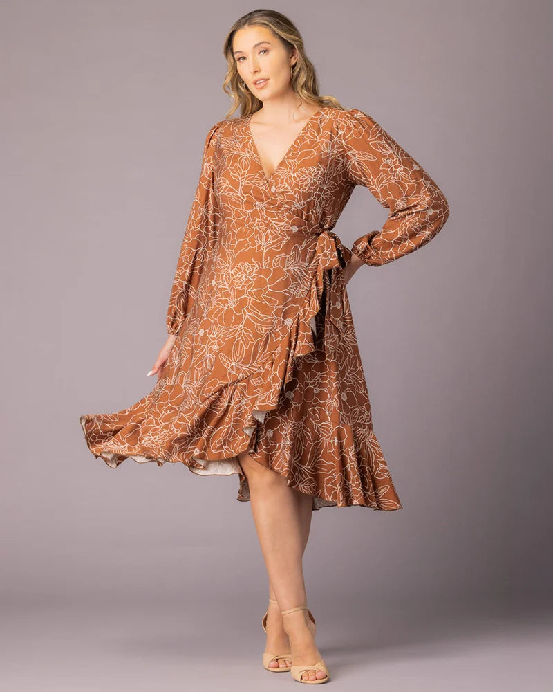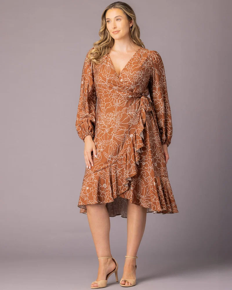 The Julia Long Sleeve Wrap Dress is a playful yet sophisticated style. Classic wrap styling, elegant lantern sleeves and flirty cascading ruffles comprise this event-ready dress. This midi length dress is ideal for work or special occasion. Luxurious rayon challis lends graceful flowy movement, perfect for twirling on the dance floor at your next event. Be the best dressed curvy guest at cocktail parties, celebrations or weddings. This dress is ideal for spring, summer and fall events. Available in a seasonal blue and green impressionist print for plus size women in sizes 0X-5X (10-32).