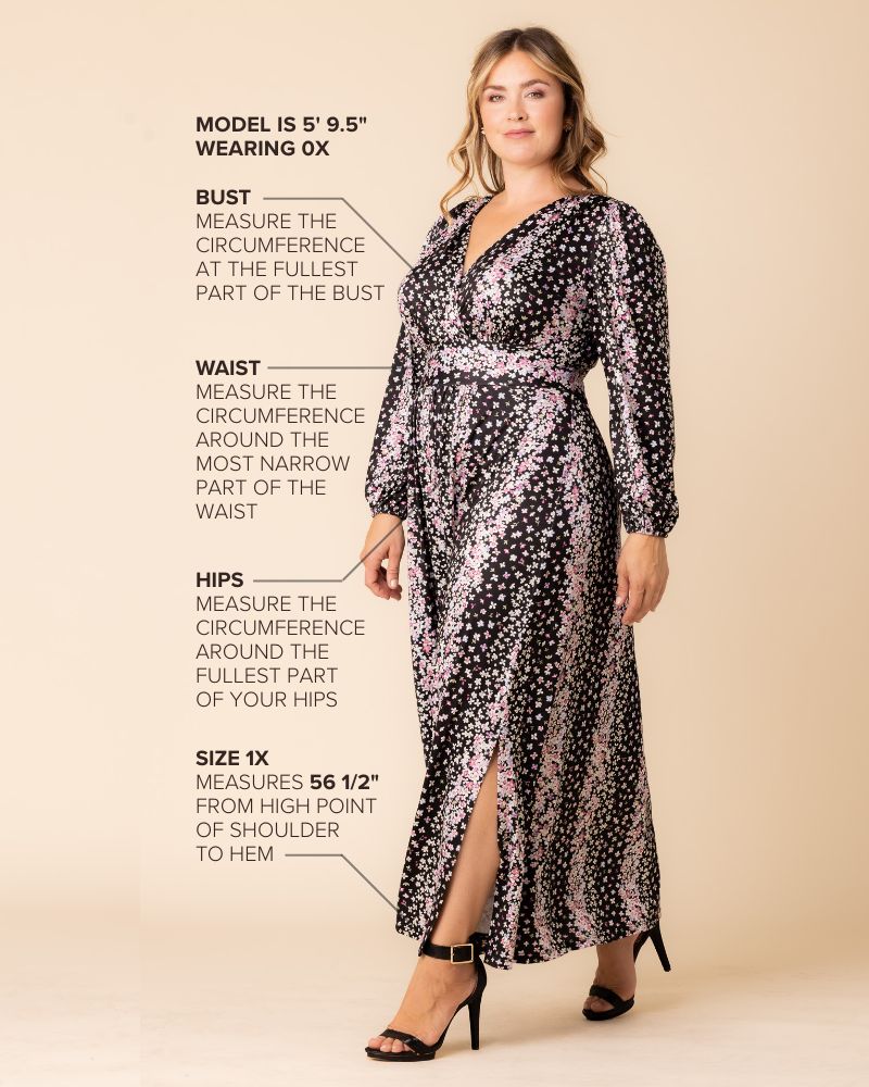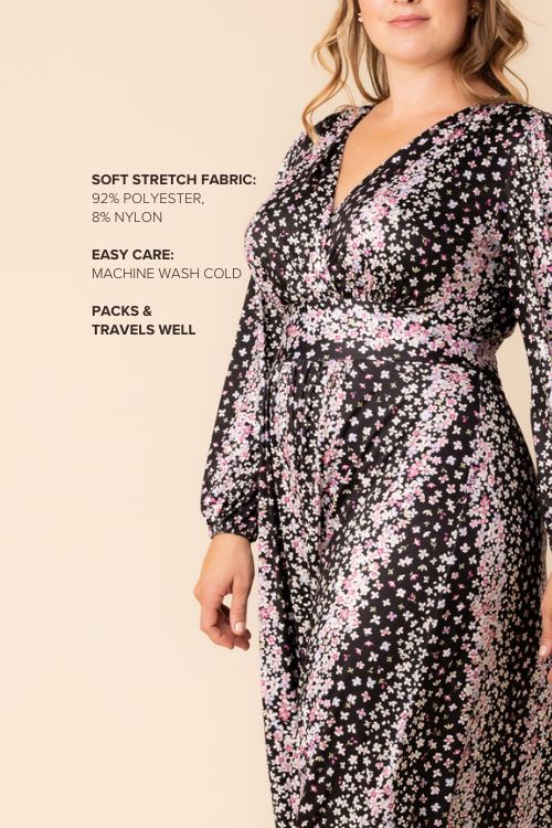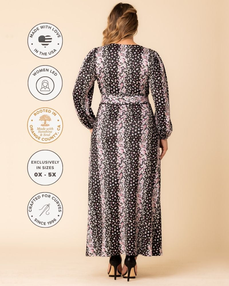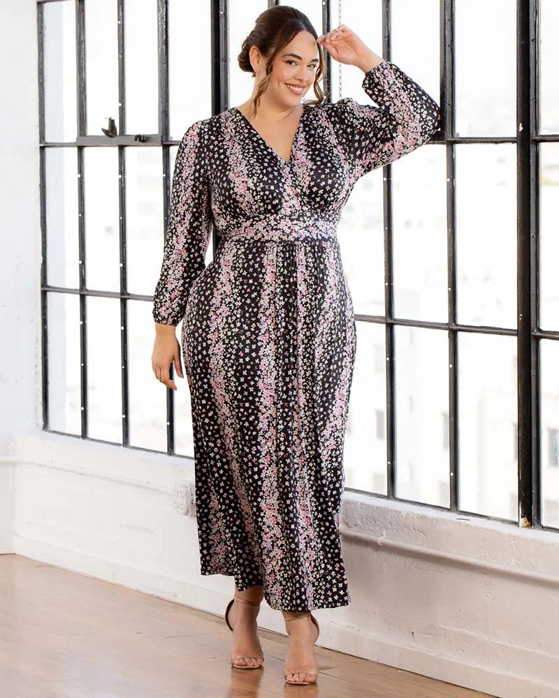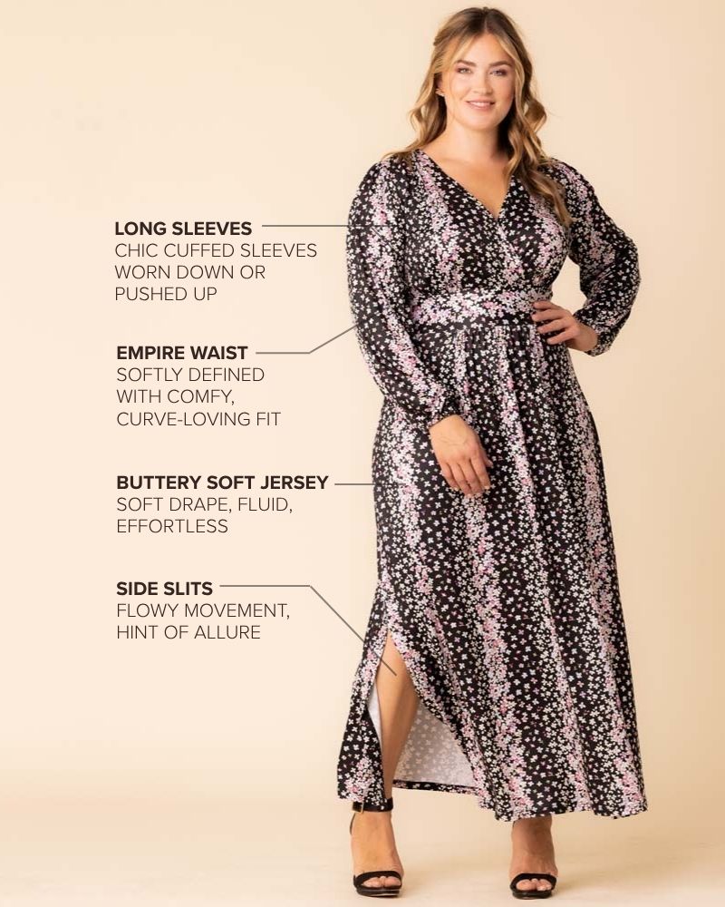 The Kelsey Long Sleeve Maxi Dress exudes sophistication. This curve-flattering maxi dress marries style and comfort in a soft yet substantial stretch jersey fabric. An elegant fall addition, it features an empire waist, flowing A-line skirt, flattering V-neck, long cuffed sleeves and side slits for movement. The Kelsey effortlessly transitions from a casual style to a refined look suitable for semi-formal occasions, making it the ideal option for a flawless wedding guest outfit. Designed exclusively for curvy figures in plus sizes (0x,1x,2x,3x,4x,5x, 12,14,16,18,20,22,24,26,28,30 and 32).