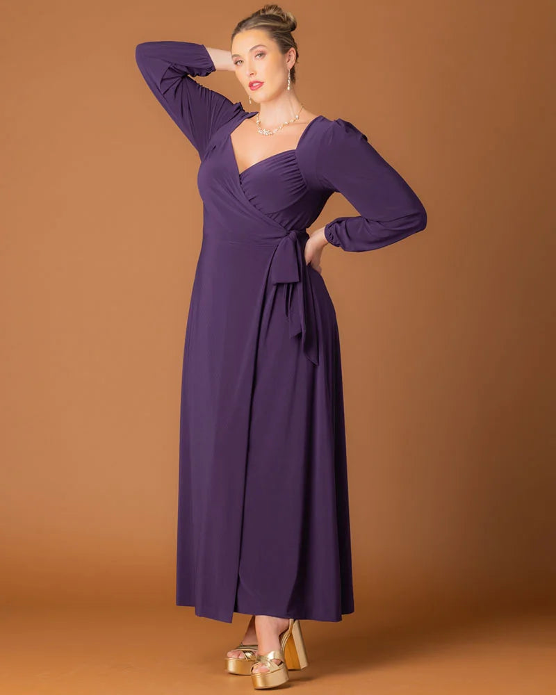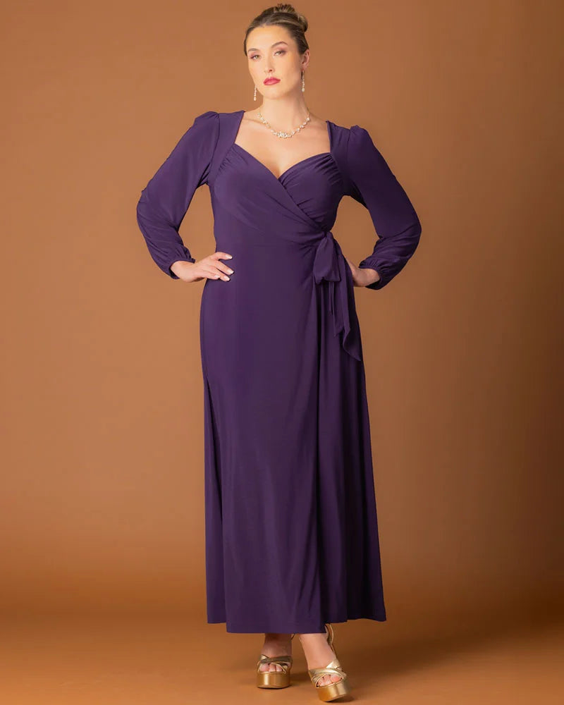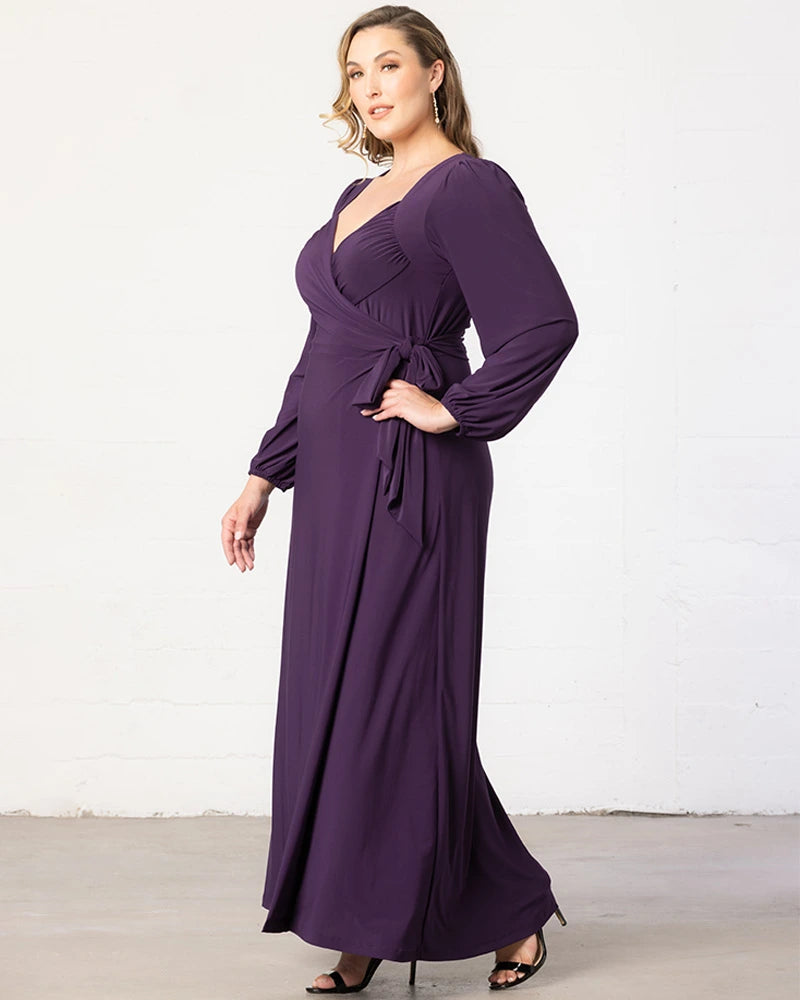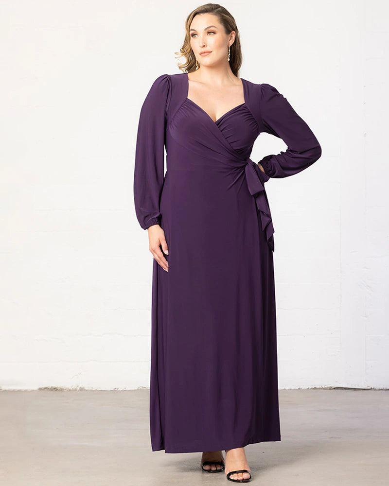 Radiate a timeless grace in our Modern Muse Wrap Gown. With elegant long sleeves and a sophisticated true wrap around design, this plus size long evening dress is sure to make a statement. Whether you're the gorgeous mother of the bride/groom, best dressed wedding guest, or are attending a cocktail or formal gala, you'll become the embodiment of the modern muse in this flattering floor length maxi dress. Available in plus sizes for curvy figures in 0x-5x and in a regal plum/purple as well as a sparkly classic black.