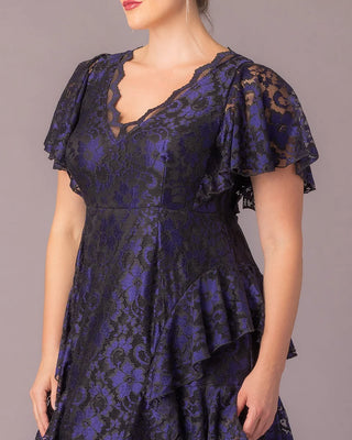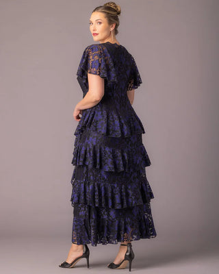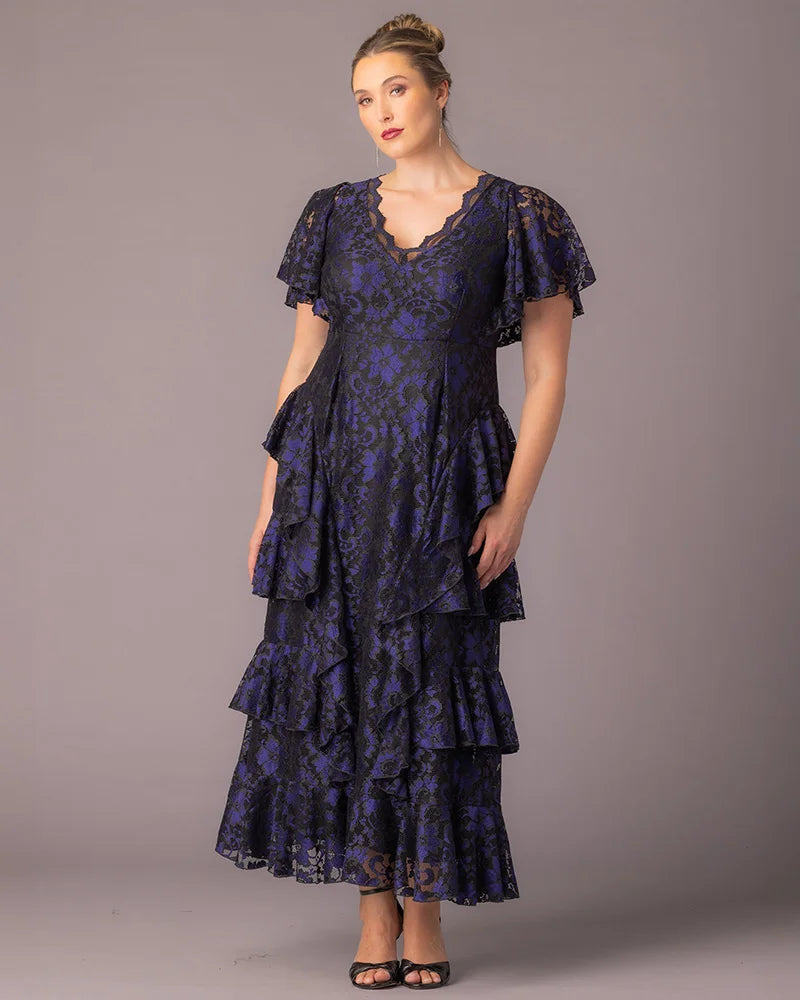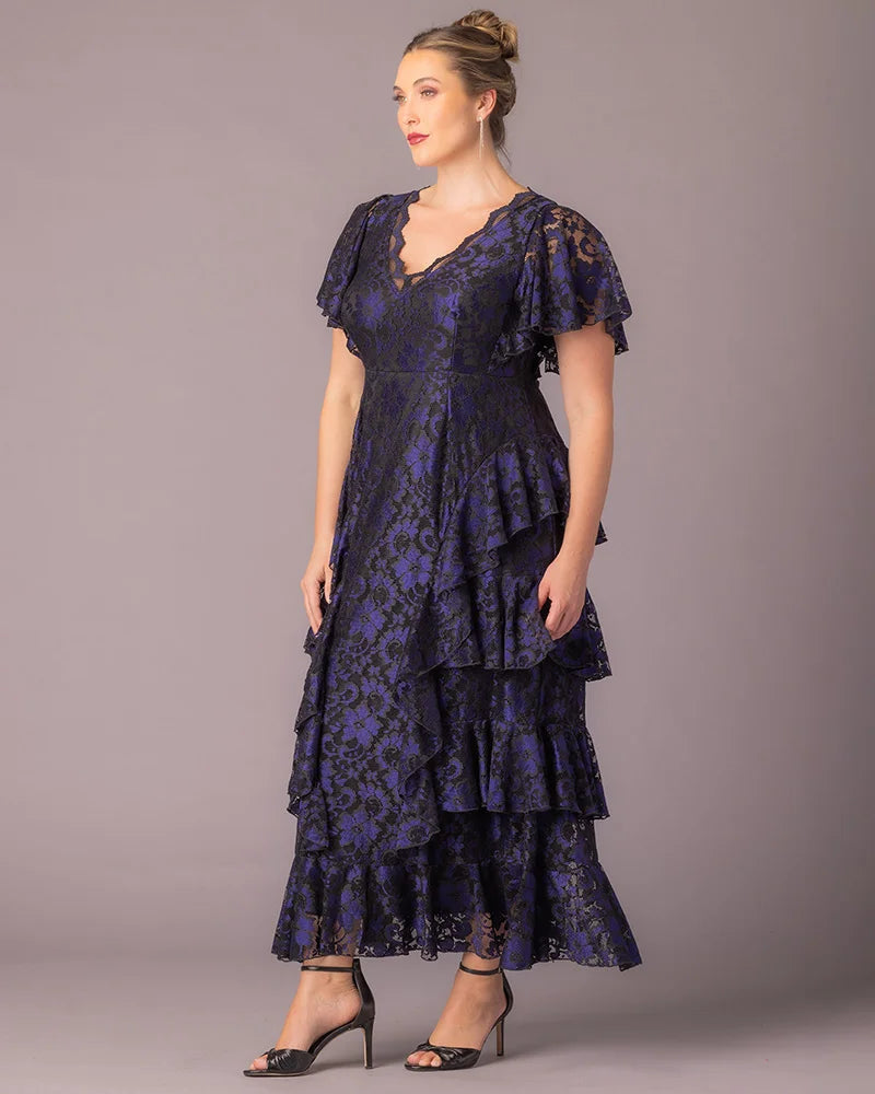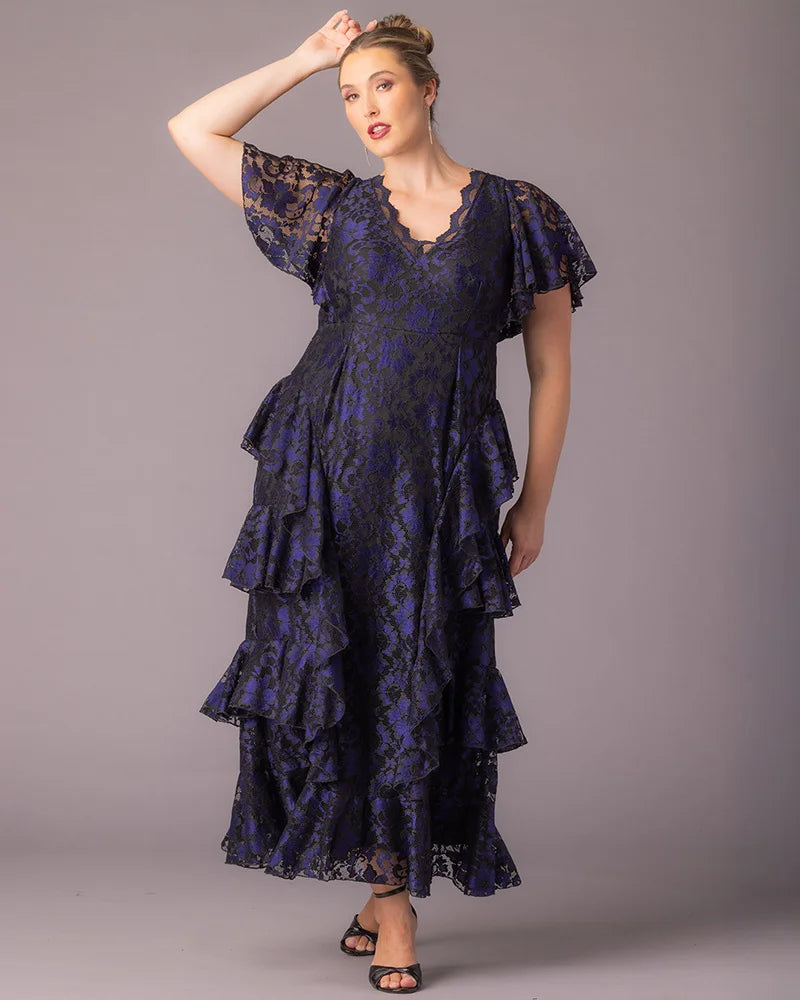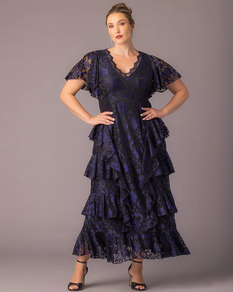 Make an unforgettable entrance in the Mon Ange Tiered Lace Evening Gown. Crafted in soft, two-tone stretch lace, this plus size floor-length gown features flattering tiers, flowy sleeves, and a scalloped lace detail at the neckline. Designed to flatter your curves, it’s a stunning choice for black tie events, galas, and any formal special occasion. Whether you're a wedding guest or the mother of the bride or groom, this elegant maxi dress brings timeless sophistication to every celebration.
