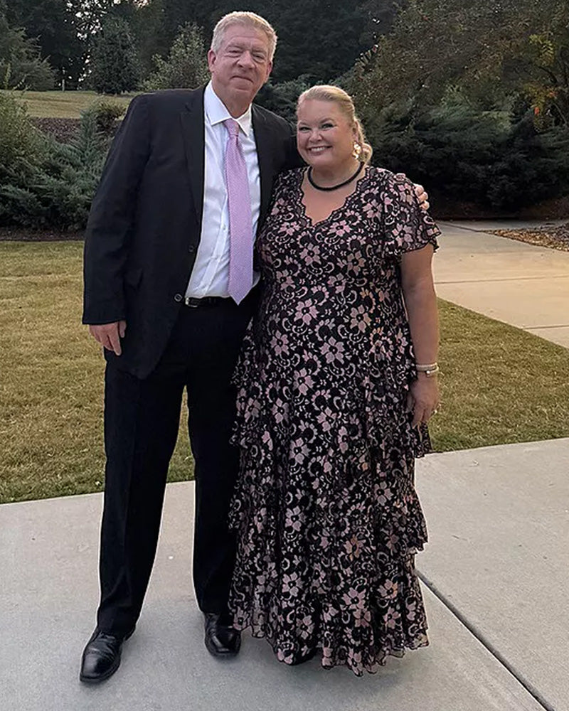 Make an unforgettable entrance in the Mon Ange Tiered Lace Evening Gown. Crafted in soft, two-tone stretch lace, this plus size floor-length gown features flattering tiers, flowy sleeves, and a scalloped lace detail at the neckline. Designed to flatter your curves, it’s a stunning choice for black tie events, galas, and any formal special occasion. Whether you're a wedding guest or the mother of the bride or groom, this elegant maxi dress brings timeless sophistication to every celebration.