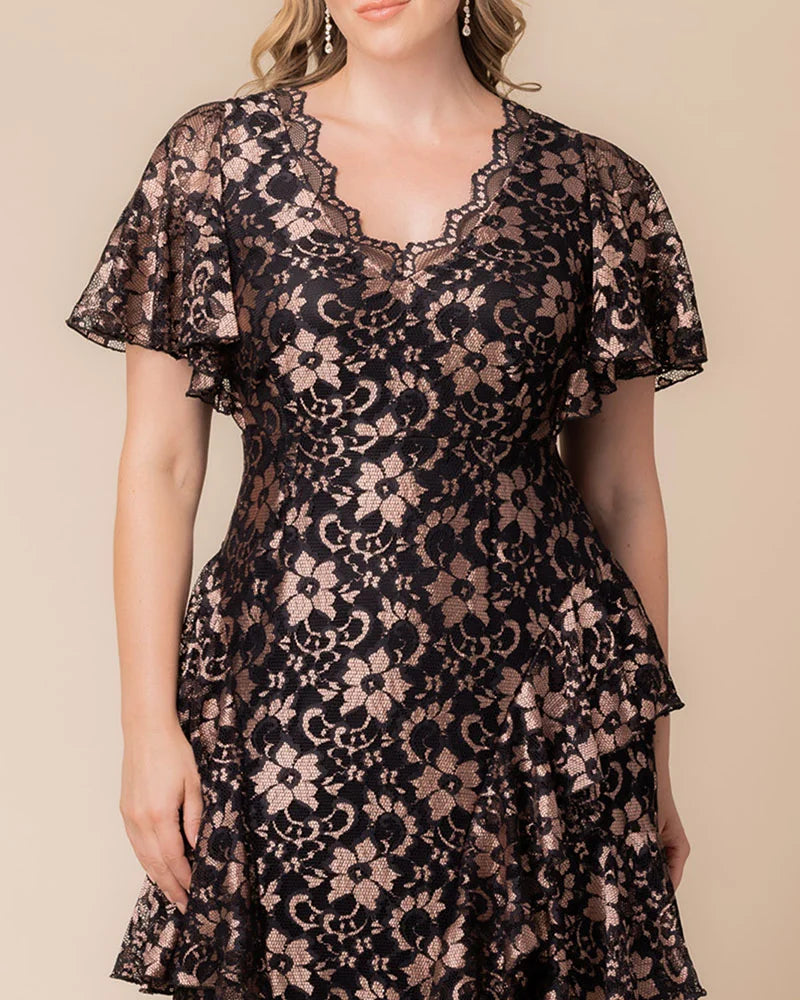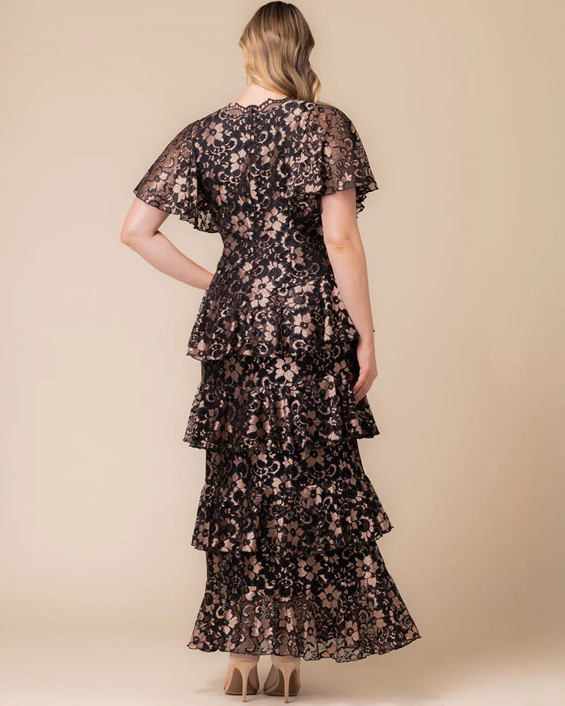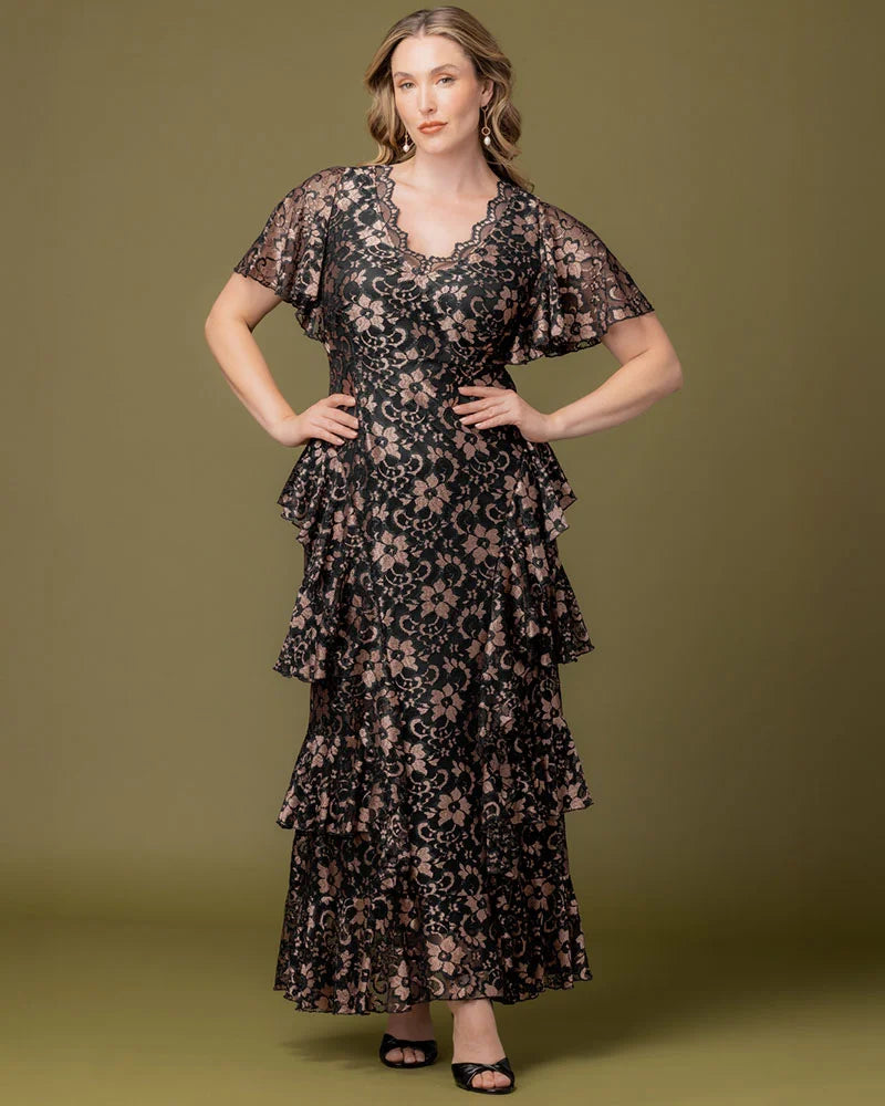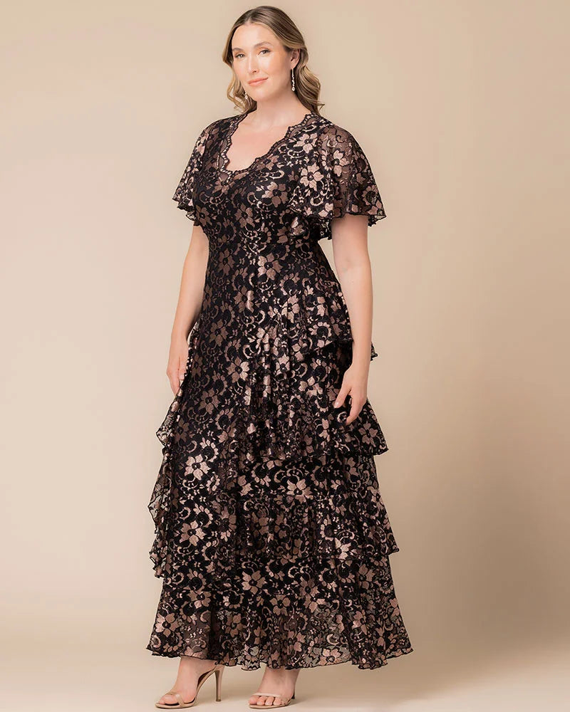 Make an unforgettable entrance in the Mon Ange Tiered Lace Evening Gown. Crafted in soft, two-tone stretch lace, this plus size floor-length gown features flattering tiers, flowy sleeves, and a scalloped lace detail at the neckline. Designed to flatter your curves, it’s a stunning choice for black tie events, galas, and any formal special occasion. Whether you're a wedding guest or the mother of the bride or groom, this elegant maxi dress brings timeless sophistication to every celebration.