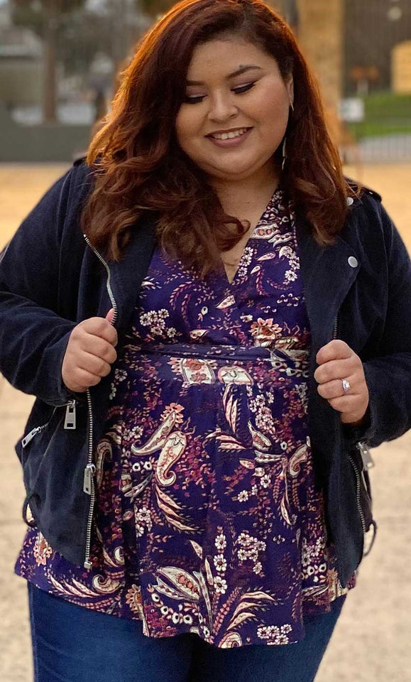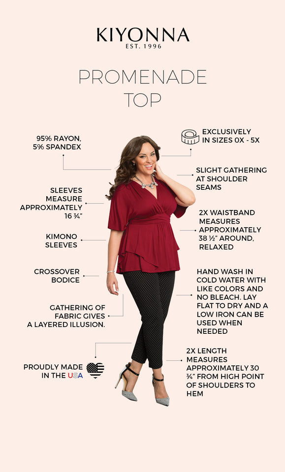 Take a relaxing stroll in our Promenade kimono sleeve top. The crossover bodice and kimono sleeves on this plus size top allow for ample coverage without losing style and comfort. Designed with a draped front for a layered look, this plus size flowy top is just what you need while enjoying the sights!