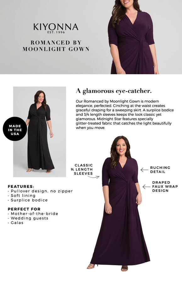 Our Romanced by Moonlight Gown is modern elegance, perfected. This plus size evening gown with sleeves features cinching at the waist creating a graceful draping for a sweeping skirt. A surplice bodice and 3/4 length sleeves keeps the look classic yet glamorous. Select colorways are crafted from specially glitter-treated fabric that catches the light beautifully when you move. All of Kiyonna's plus size long formal dresses are made with love in the USA.