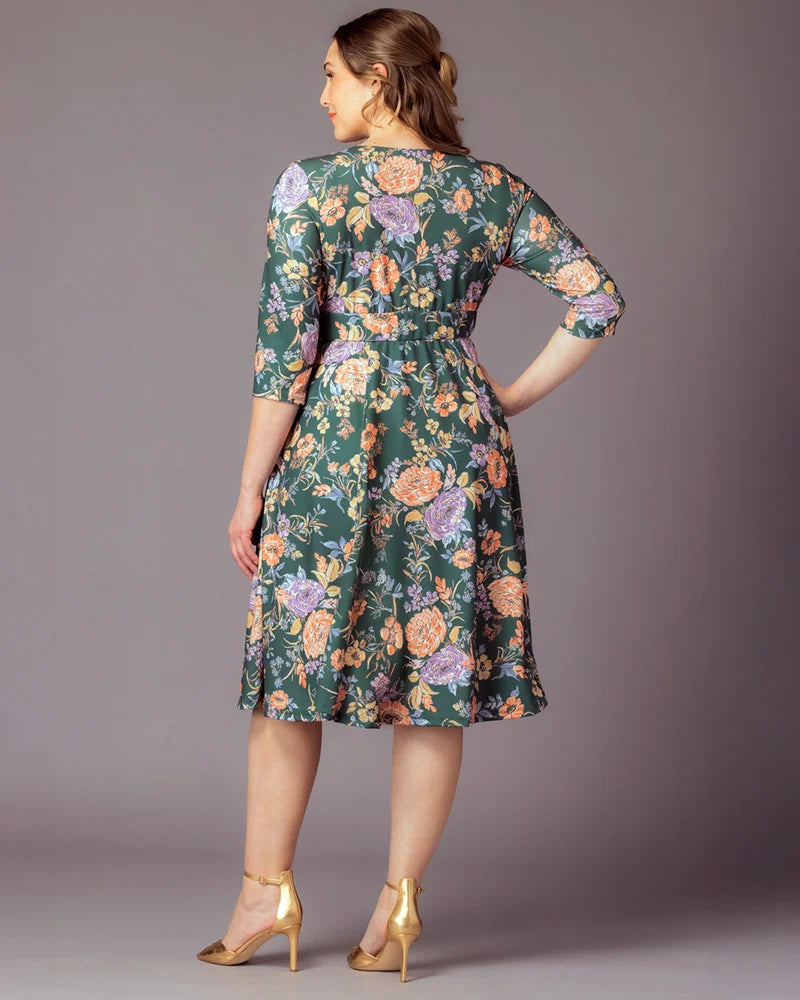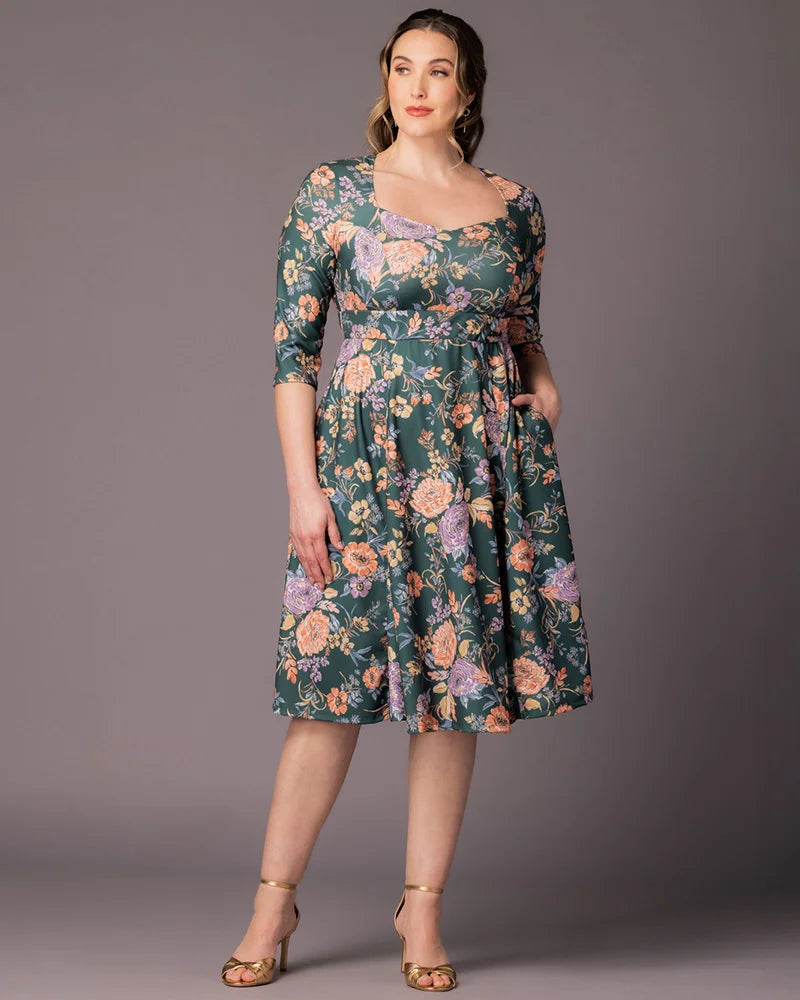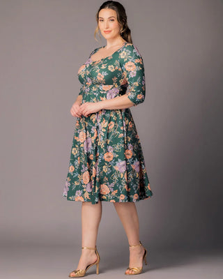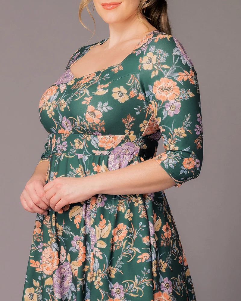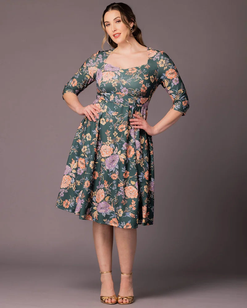 Turn heads in the Royal Sweetheart Cocktail Dress, a stunning plus size midi dress designed for unforgettable moments. This eye-catching piece features a chic sweetheart neckline and slim 3/4 sleeves for a sophisticated silhouette. The knee-length A-line skirt is enhanced with godets that add extra volume, ensuring a flattering fit that highlights your curves. Gilded Noir features a metallic gold floral pattern that brings a touch of glamour to any formal event. Perfect for wedding guests, cocktail parties, and special occasions, you’ll feel radiant and confident wherever the night takes you.