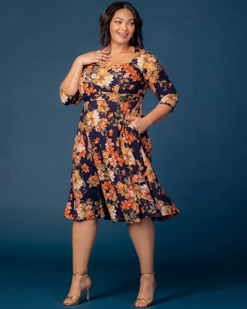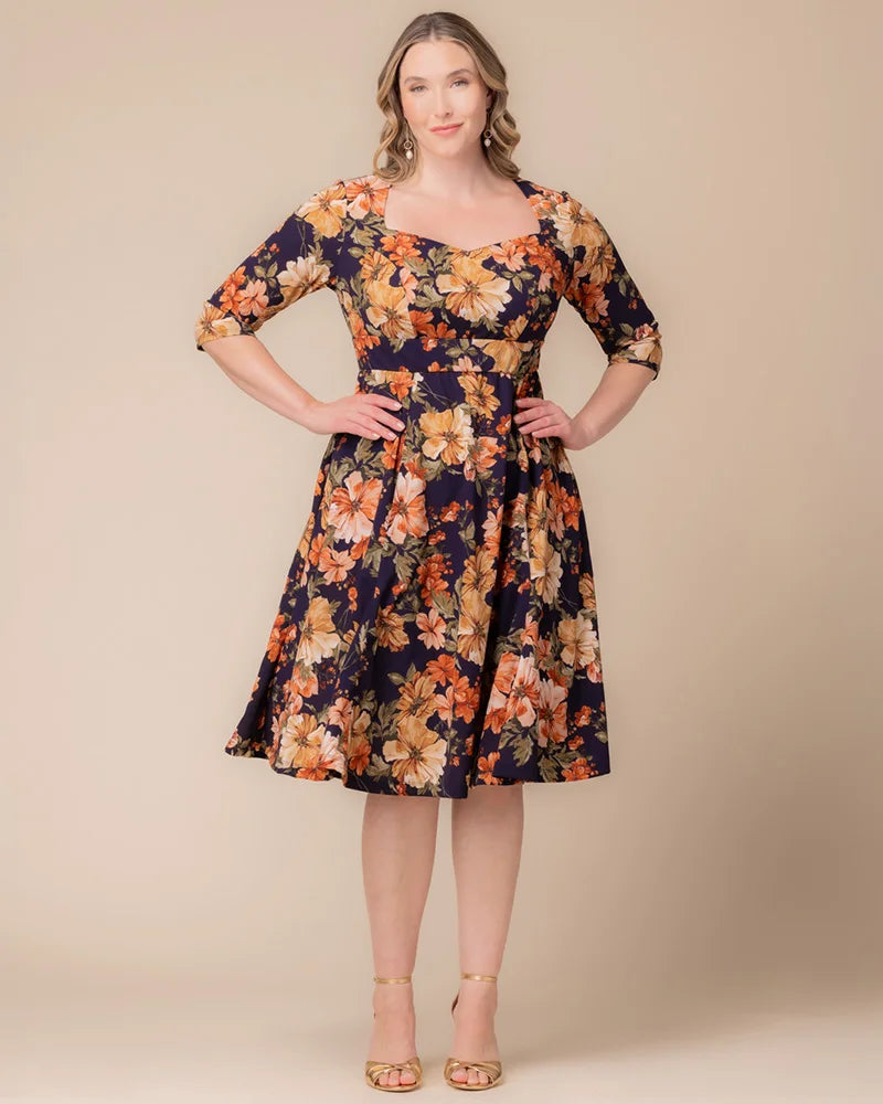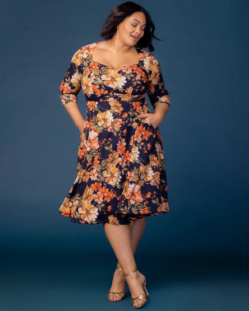 Turn heads in the Royal Sweetheart Cocktail Dress, a stunning plus size midi dress designed for unforgettable moments. This eye-catching piece features a chic sweetheart neckline and slim 3/4 sleeves for a sophisticated silhouette. The knee-length A-line skirt is enhanced with godets that add extra volume, ensuring a flattering fit that highlights your curves. Gilded Noir features a metallic gold floral pattern that brings a touch of glamour to any formal event. Perfect for wedding guests, cocktail parties, and special occasions, you’ll feel radiant and confident wherever the night takes you.