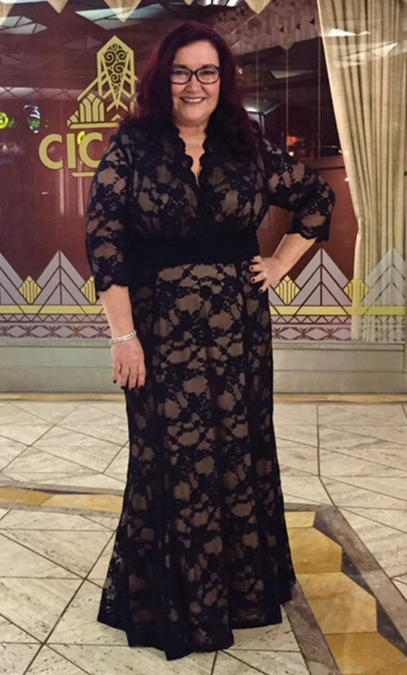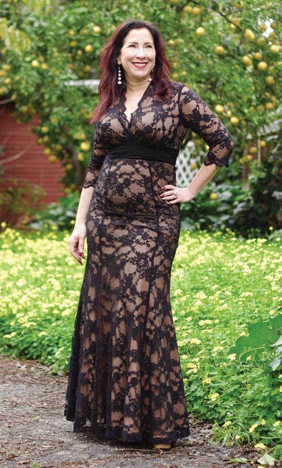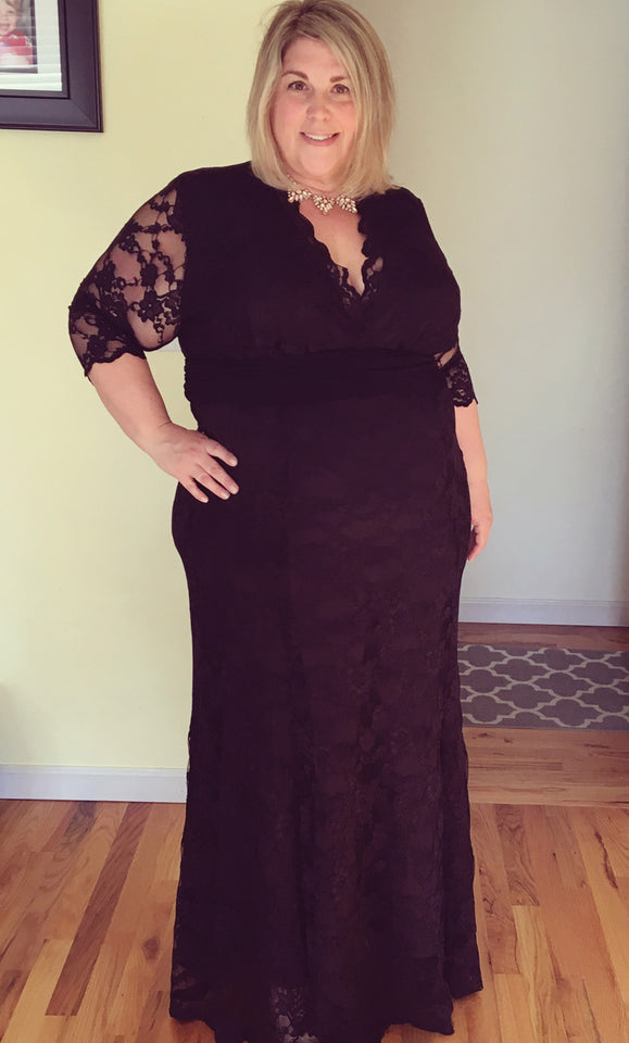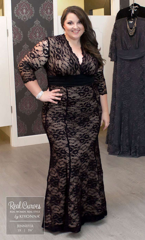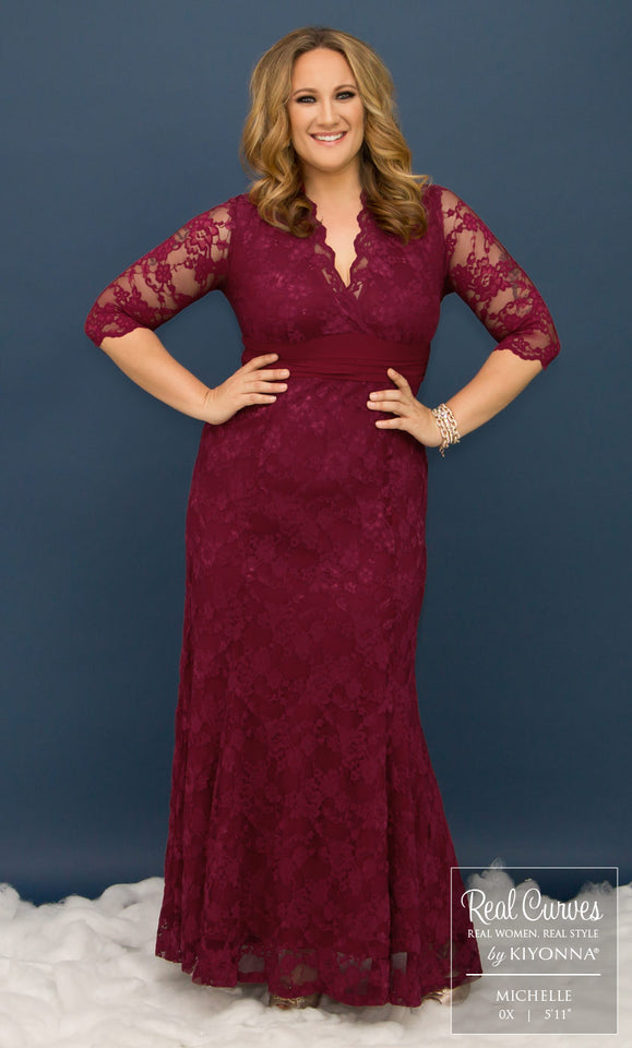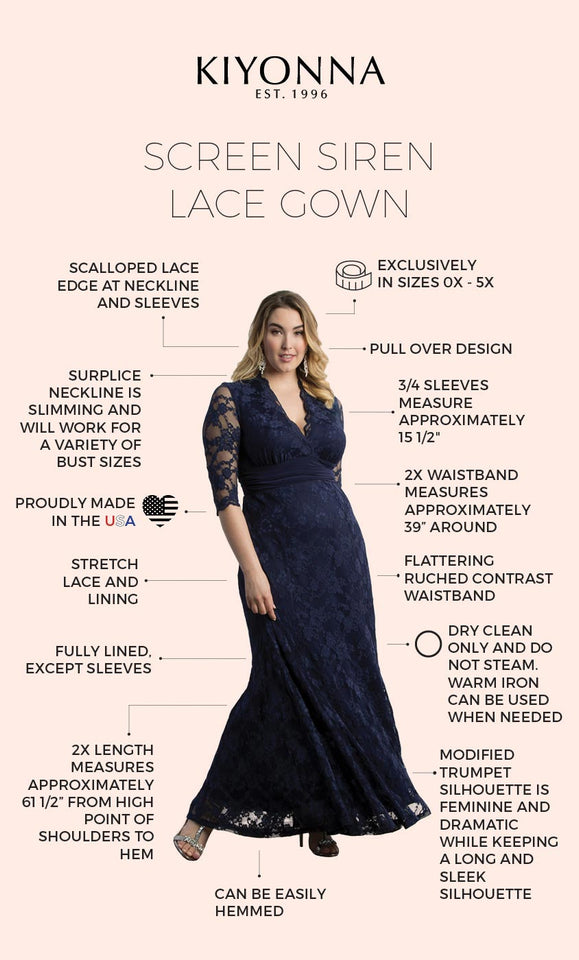 Effortless beauty meets classic style with our Screen Siren Lace Gown. Designed with all-over stretch, this elegant fit and flare evening dress will flatter and accentuate your beautiful curves. A ruched waistband in a contrasting fabric pulls the eye inward to the smallest part of your body and a scalloped neckline and sleeves add that special detailing. This plus size special occasion dress is the ideal formal pick for any black-tie affair. Kiyonna's plus size formal gowns and special occasion dresses are available exclusively in women’s plus sizes.