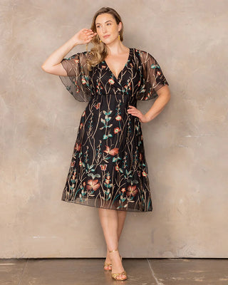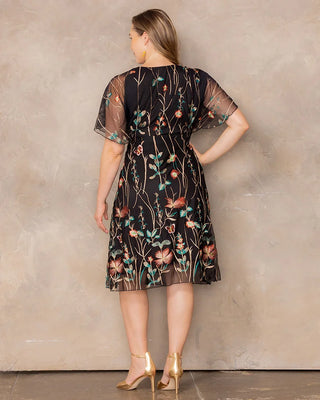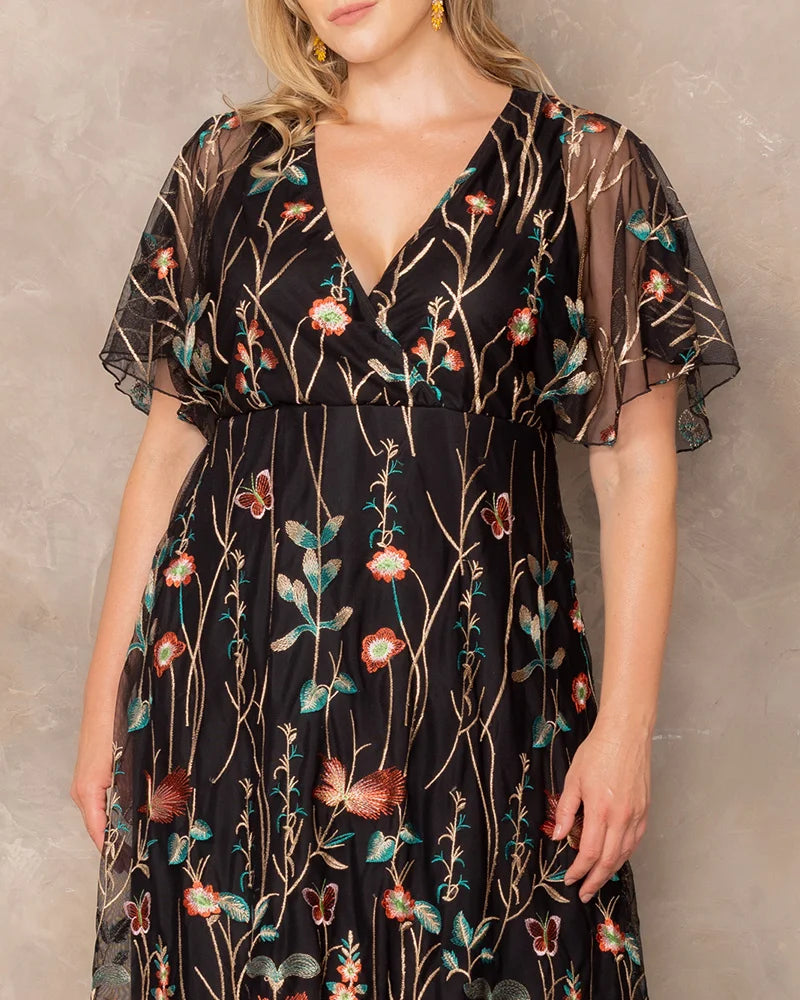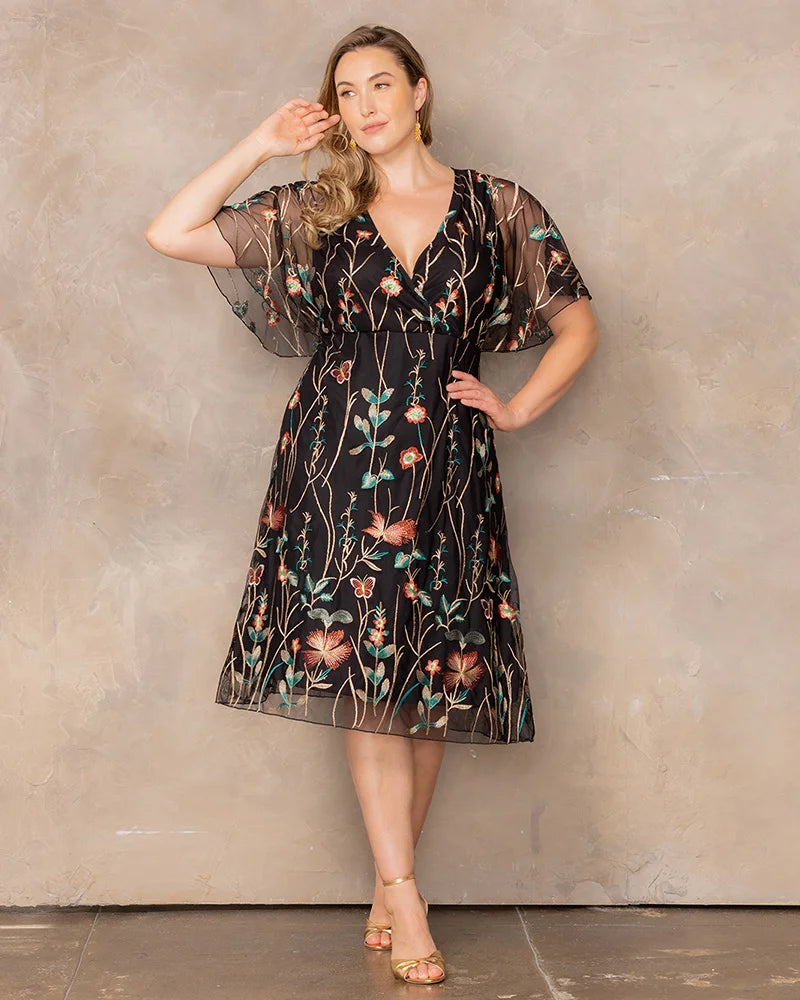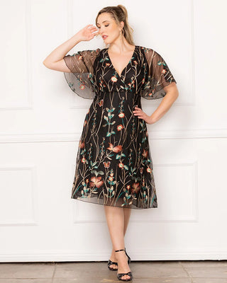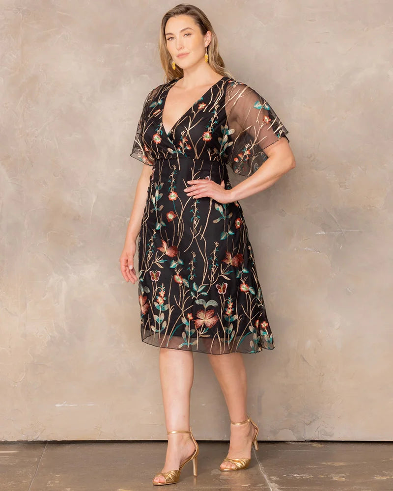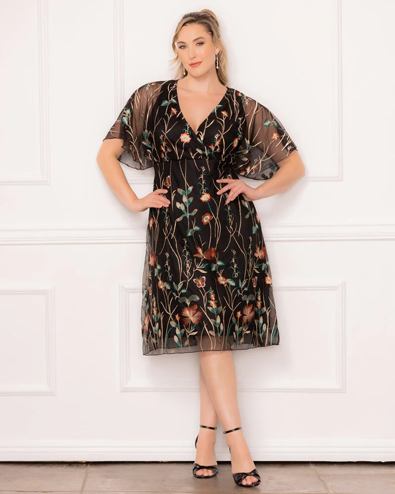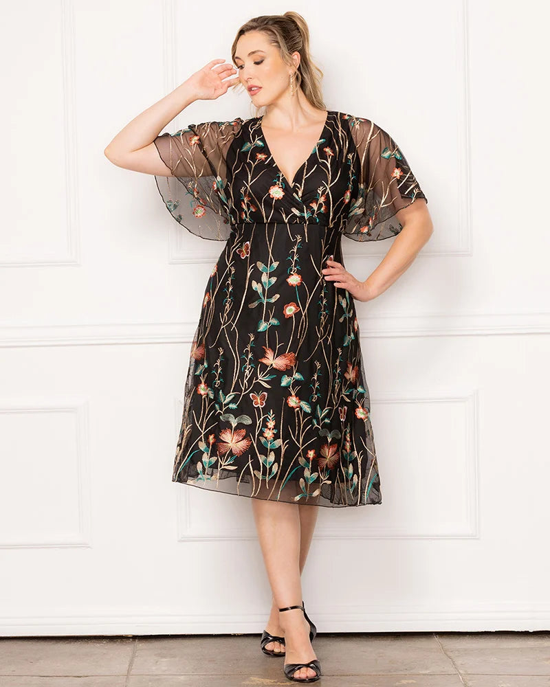 Let your style tell a story with the Sonnet Embroidered Midi Cocktail Dress. Designed to complement your curves, this plus size stunner features delicate floral mesh embroidery, a surplice neckline, and whimsical flutter sleeves that add a romantic touch. The empire waist flatters your figure, while the lined bodice and short skirt ensure a comfortable fit. Whether you're a wedding guest, attending a garden party, or heading to a cocktail event, this dreamy knee-length dress blends charm and sophistication, making it perfect for any special occasion.
