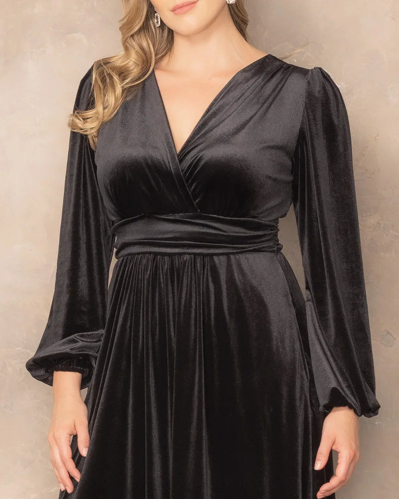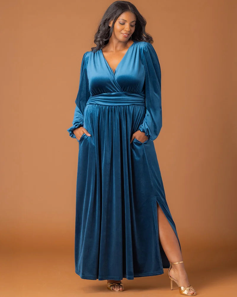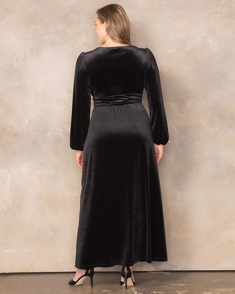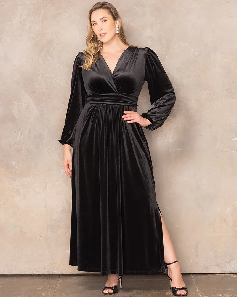 Make your entrance unforgettable in the Vivienne Velvet Evening Gown. Crafted from plush stretch velvet with a rich, luminous sheen, this floor-length plus size gown features a surplice V-neckline, long cuffed sleeves, and a softly shirred waistband. Side slits add just the right amount of drama, while hidden pockets bring a practical touch without compromising the sleek silhouette. Perfect for black-tie events, galas, and holiday parties, it’s also a stunning choice for a wedding guest or the mother of the bride or groom.