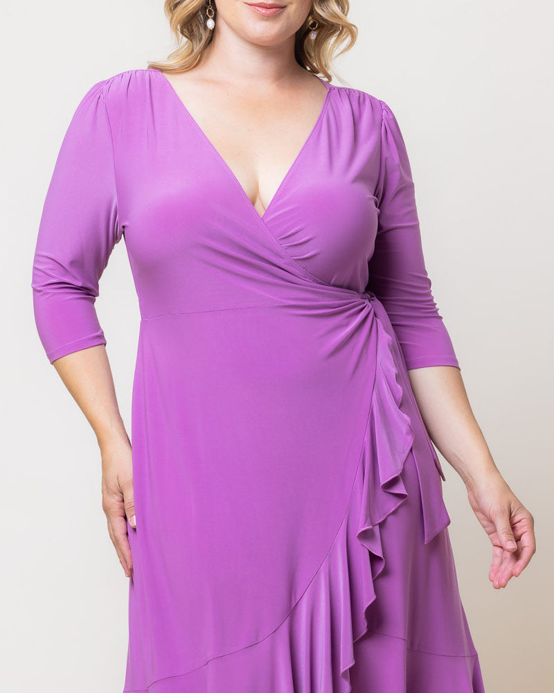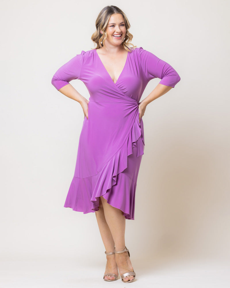 Our Whimsy Wrap Dress is a flirty piece with beautiful cascading flounces along the skirt's front panels and bottom hem. This functional wrap dress is the perfect silhouette for all curvy body types and the extra cinch feature at the waist will only accentuate your fabulous curves even more. The cross-over neckline is great for adjusting the wrap to your preferred coverage and you will love the fitted sleeves with a little extra gathering on the cap for added detail. The Whimsy Wrap Dress will live up to its name as you exude playfulness while maintaining your chic and feminine style. Available exclusively in women's plus sizes.