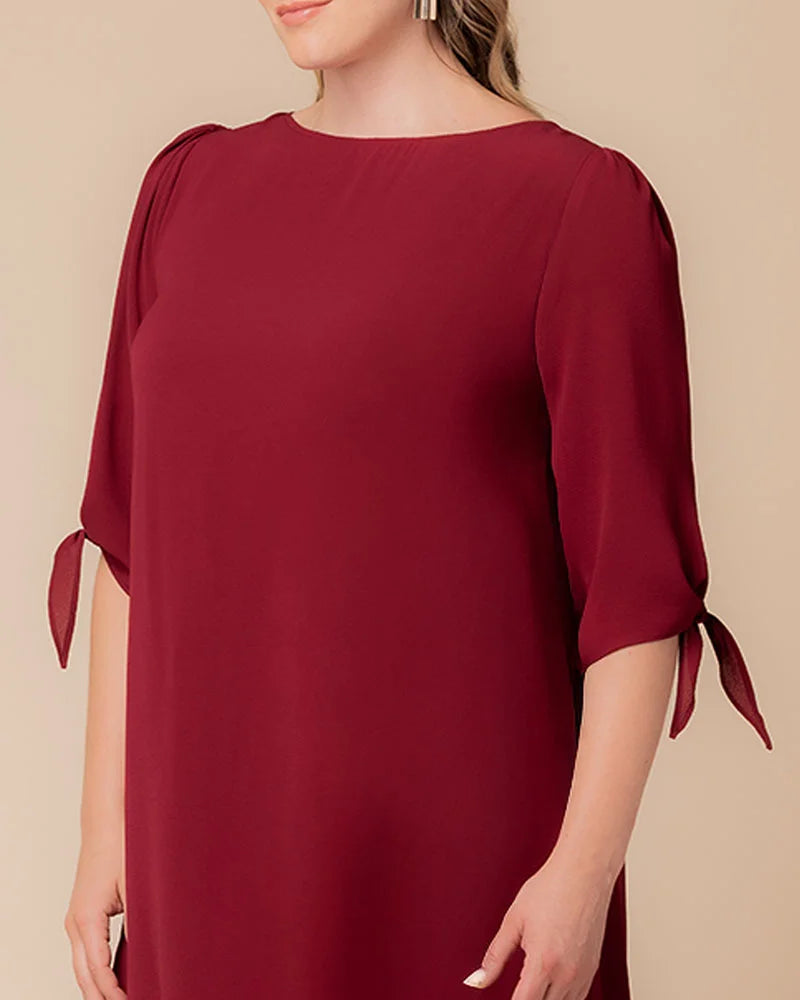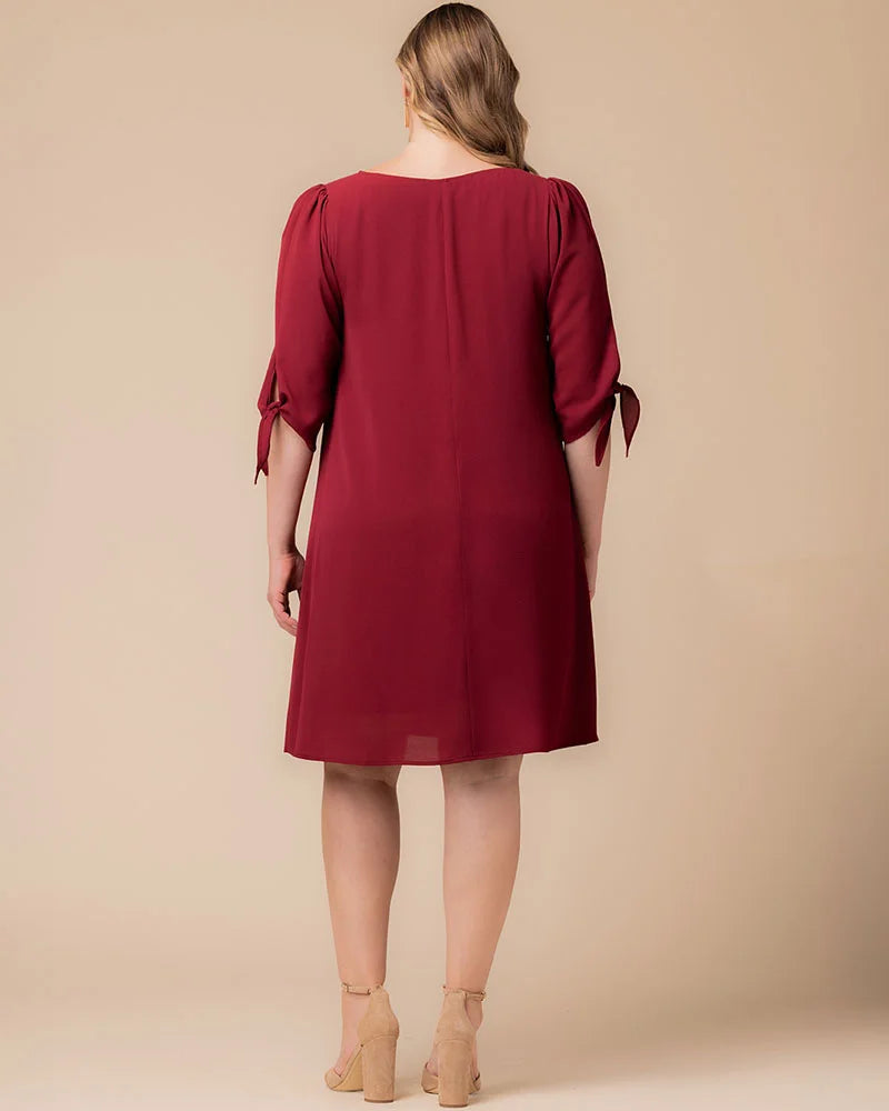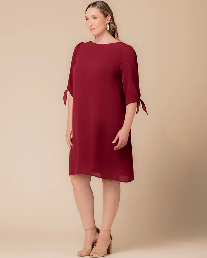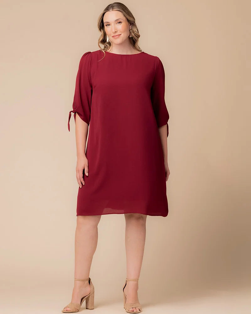 Discover effortless elegance with our Manhattan A-Line Shift Dress. This knee-length, fully lined dress features darts at the front bust and shirring at the sleeve cap for a flawless fit that complements your curves. The 3/4 length sleeves with a tie closure add a sophisticated touch. Ideal for both work and cocktail parties, this versatile plus size midi dress blends comfort with style. Its flattering A-line silhouette makes it the perfect choice for wedding guests who want to look chic and feel fabulous.